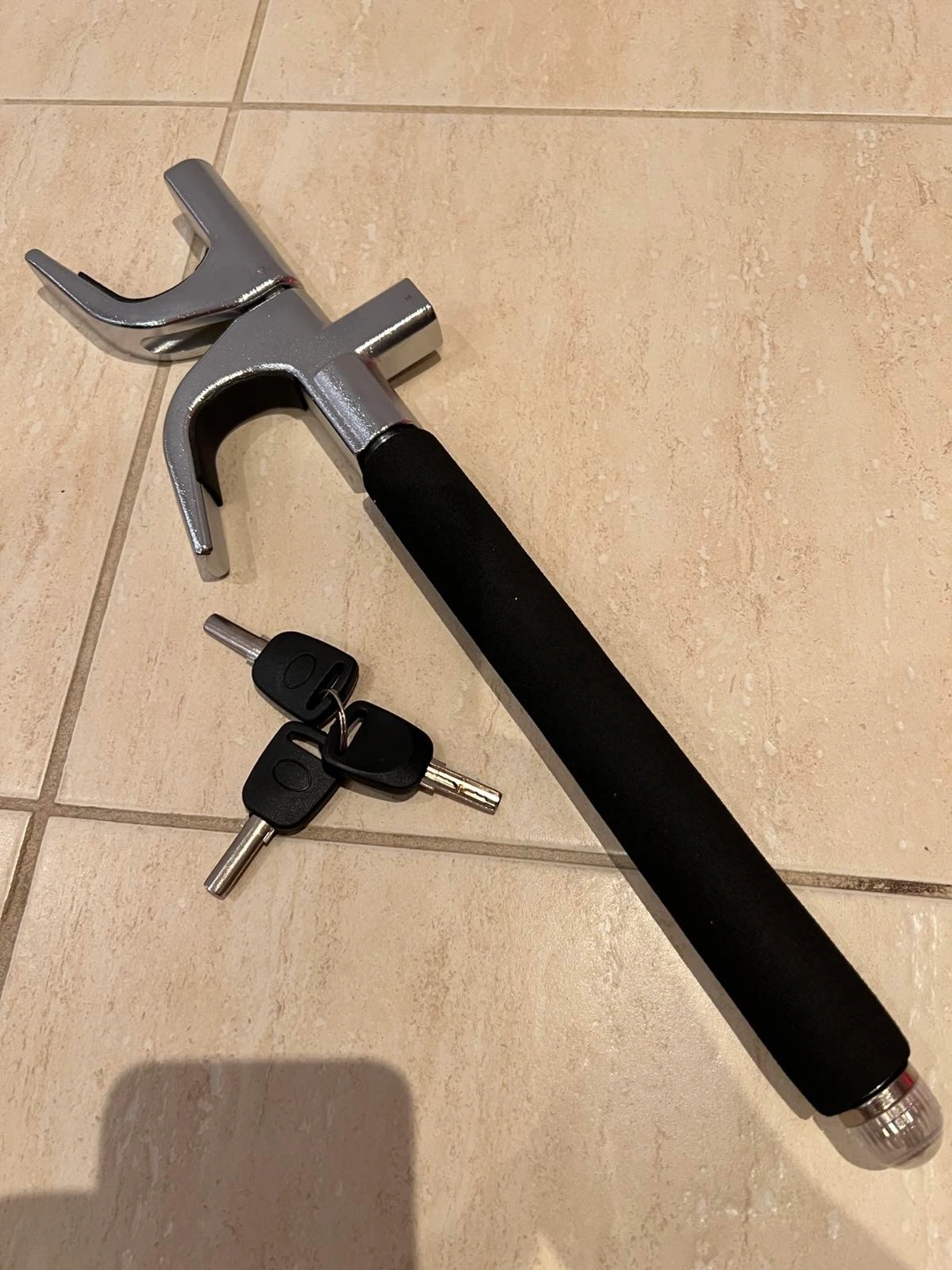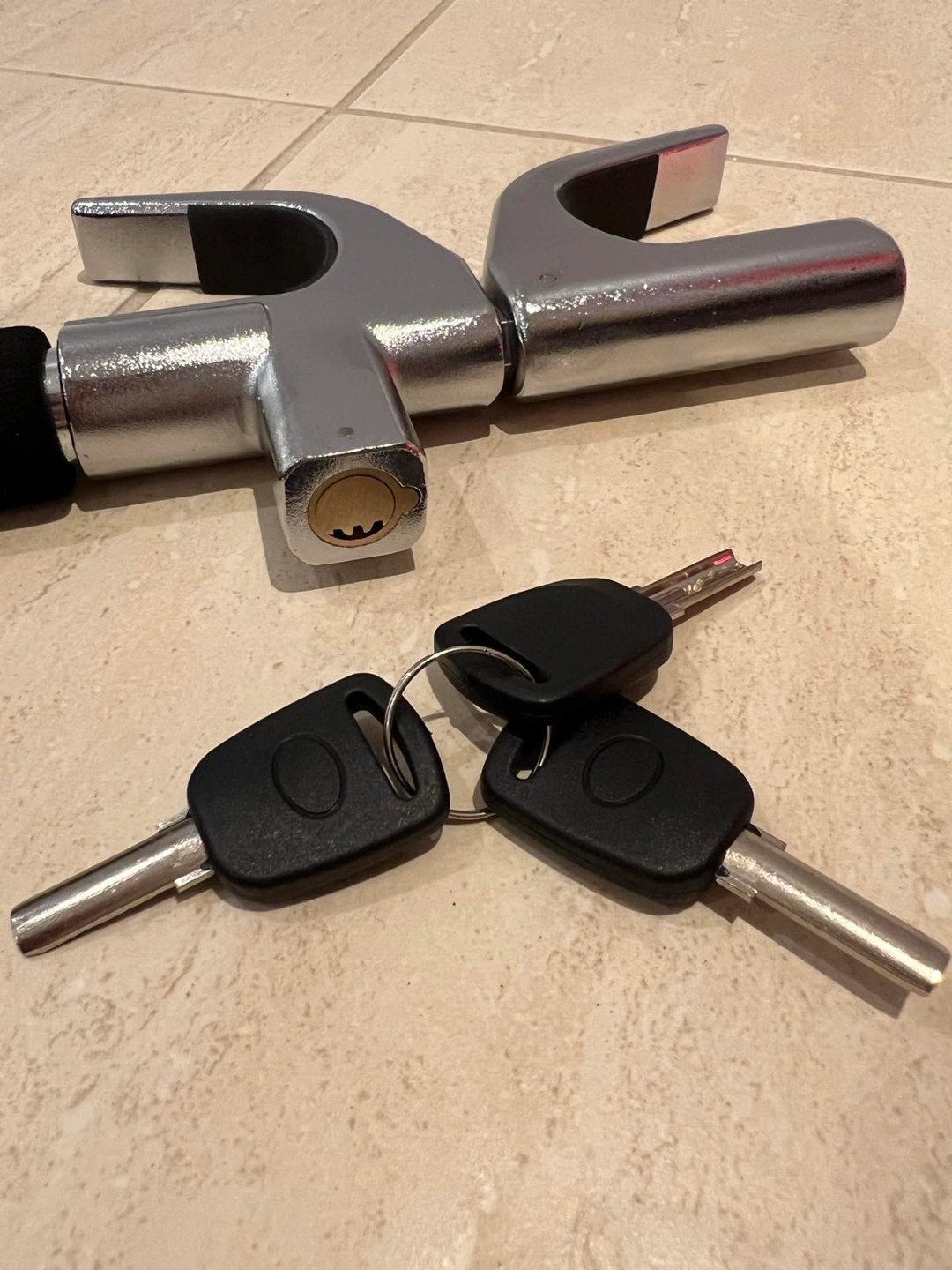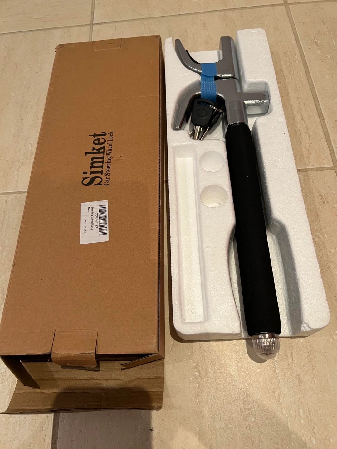 Selling a Simket car steering wheel lock. It's an anti-theft device to keep your car safe. Includes the box, keys, and all components shown in the pictures