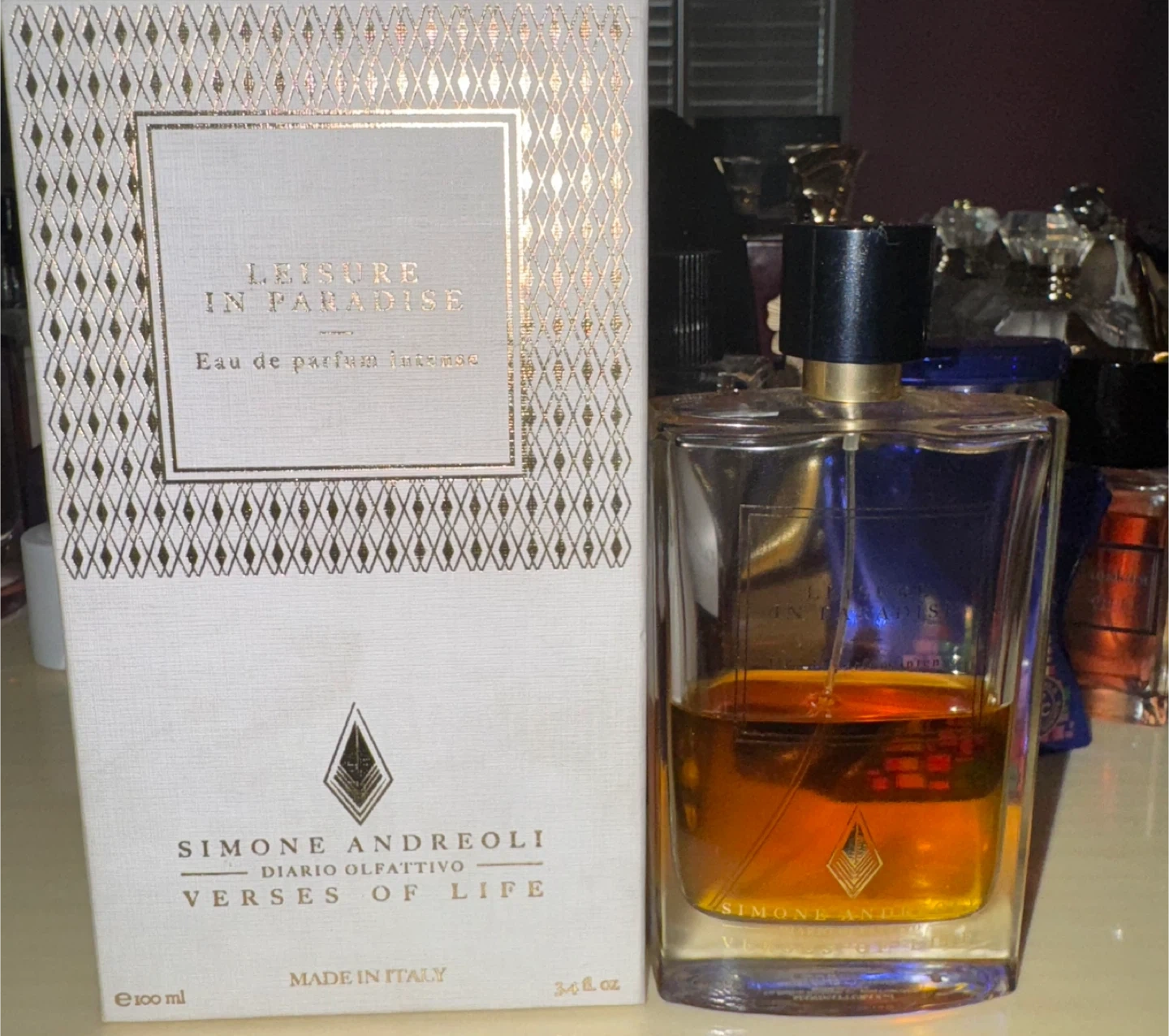 Selling a bottle of Simone Andreoli Leisure in Paradise Eau de Parfum Intense! This fragrance comes in a 100ml bottle and is made in Italy. It's part of the Diario Olfattivo Verses of Life collection by Simone Andreoli.