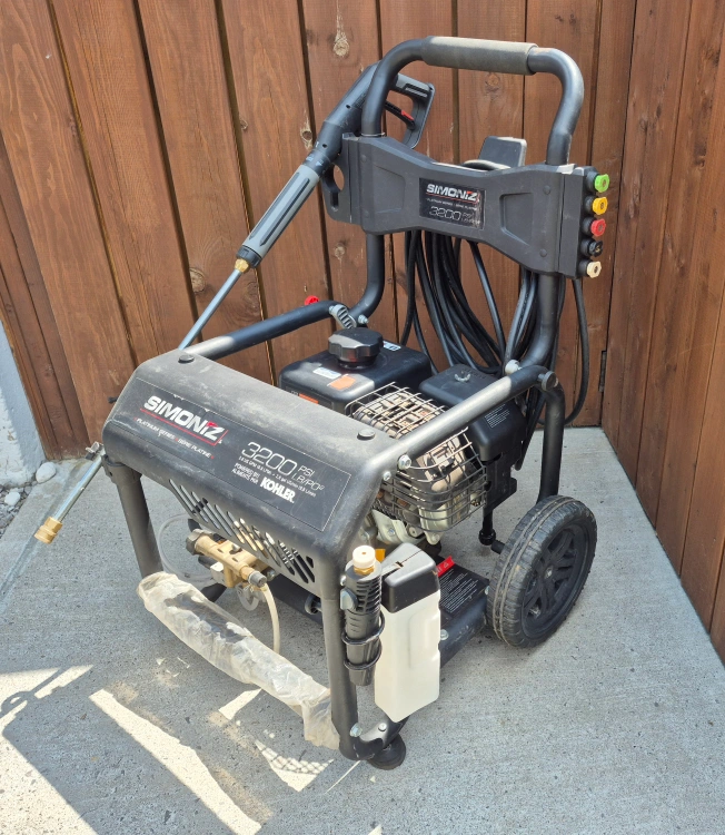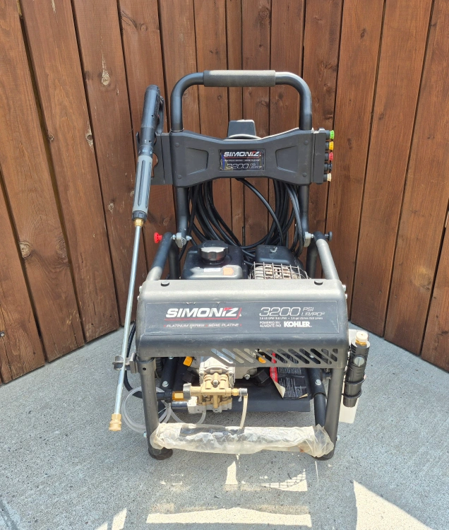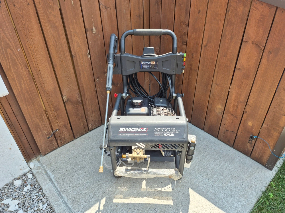 Simoniz 3200 PSI pressure washer, platinum series for sale. In great working condition and rarely used. 50ft hose, foam cannon, detergent tank and 0, 15, 25, 40 degree jet nozzle attachments. Reliable 193hp Kohler engine. Great for cleaning decks, driveways, and more!