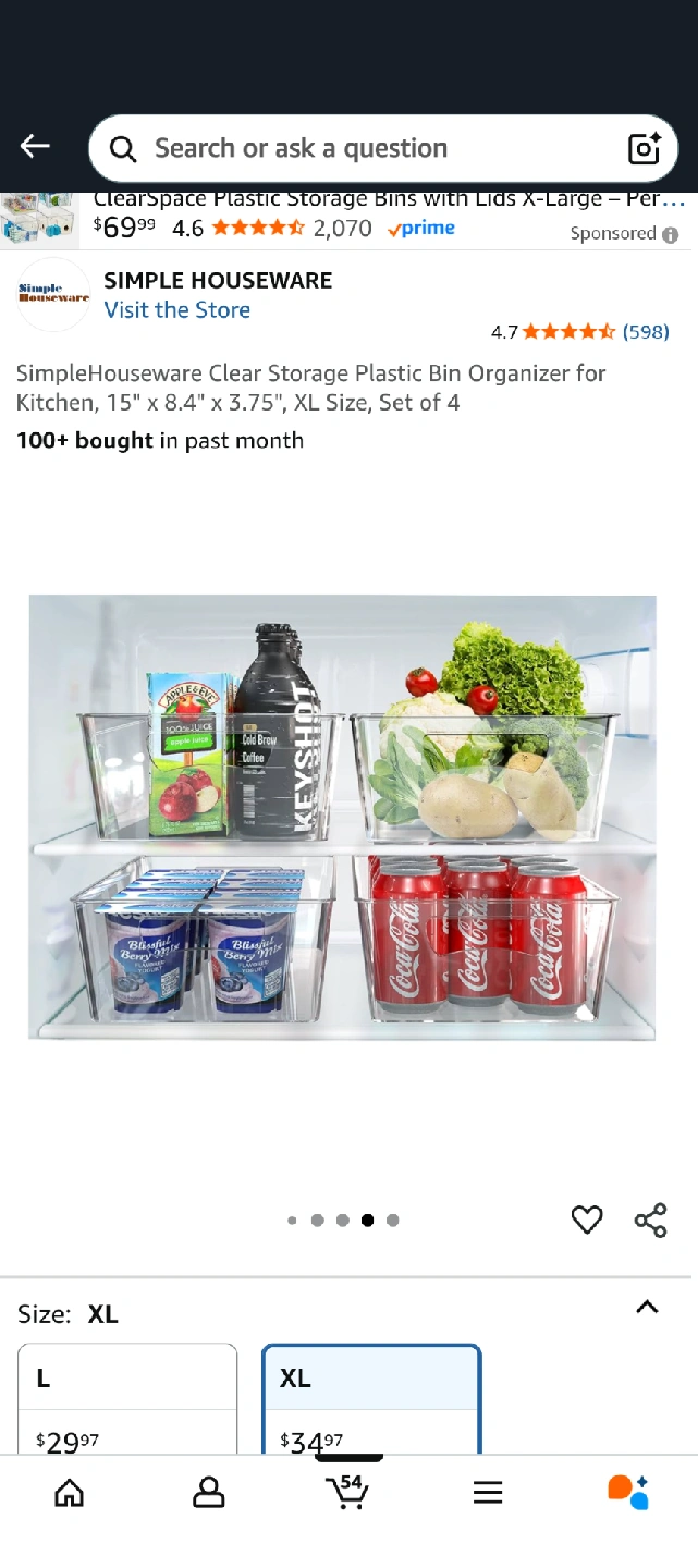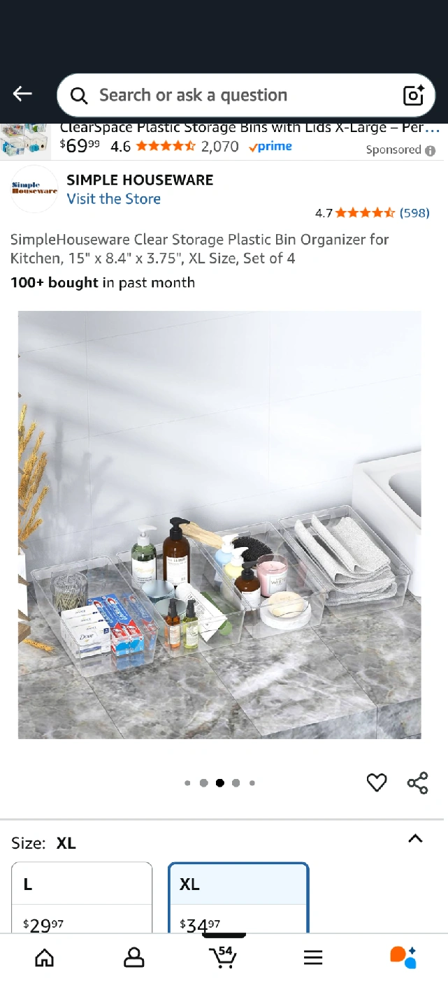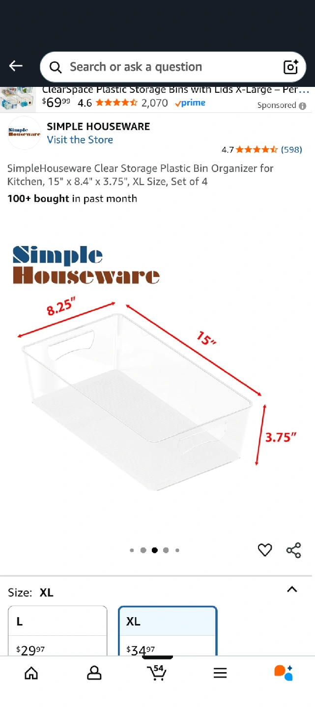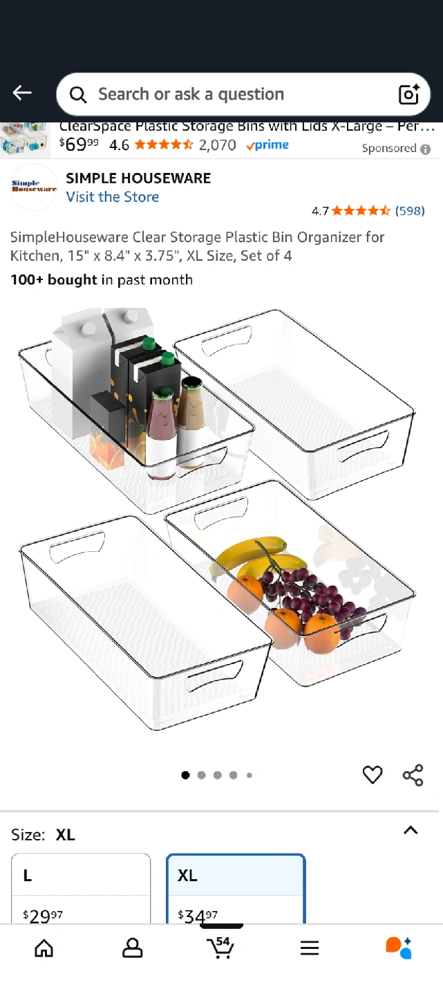 Selling a set of 4 Simple Houseware clear storage bins. They are XL size, perfect for organizing your kitchen or any other space. - Dimensions: 15" x 8.4" x 3.75" - Made of clear plastic - Great for kitchen, pantry, or bathroom organization