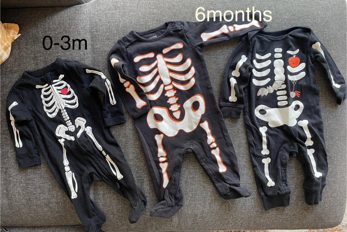 Selling three cute skeleton rompers from Simple Joys! Sizes range from 0-3 months to 6 months. Perfect for Halloween $5 each
