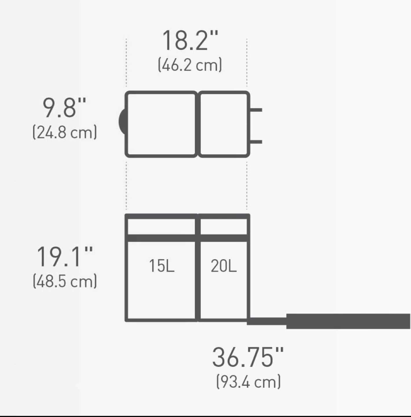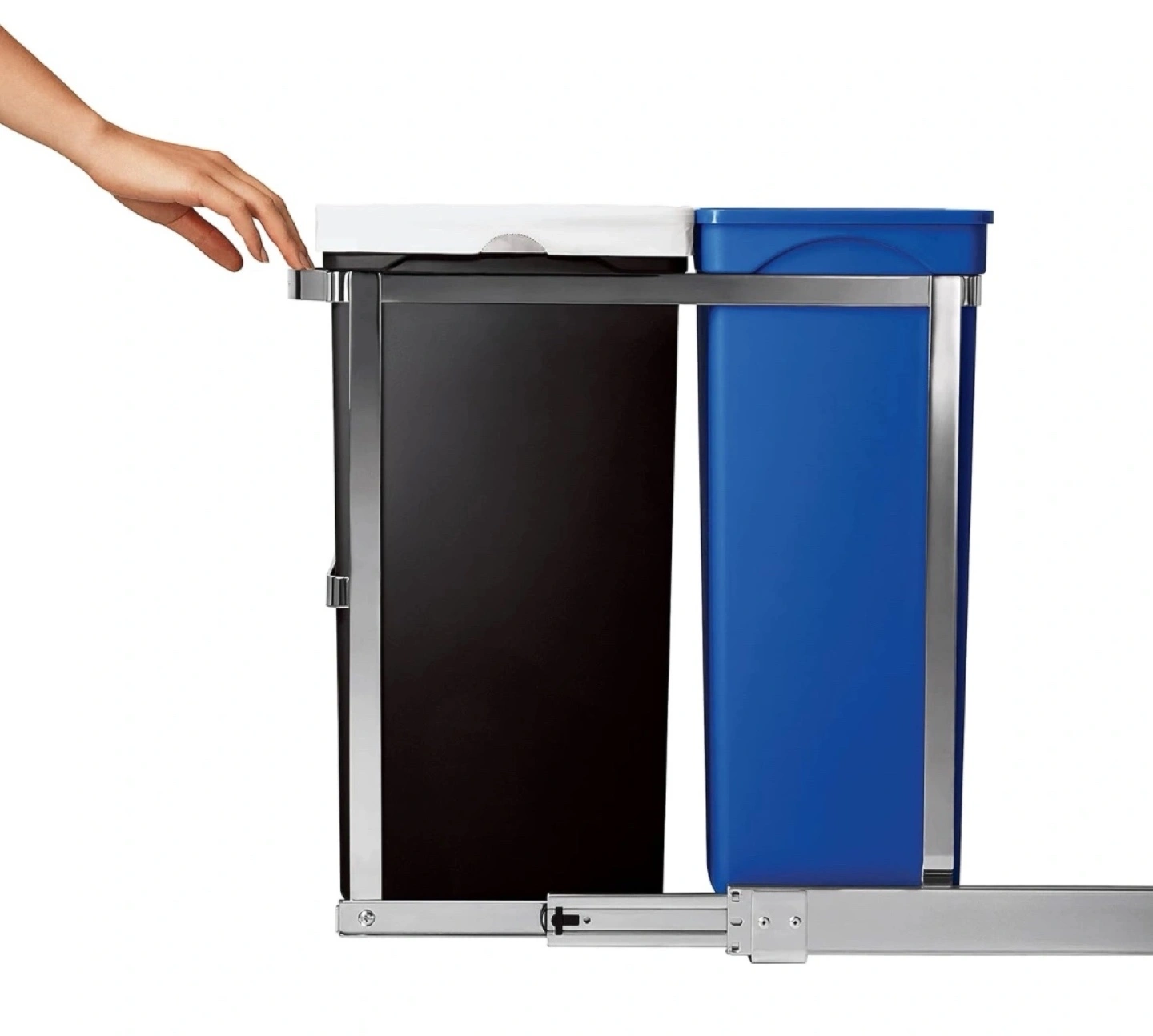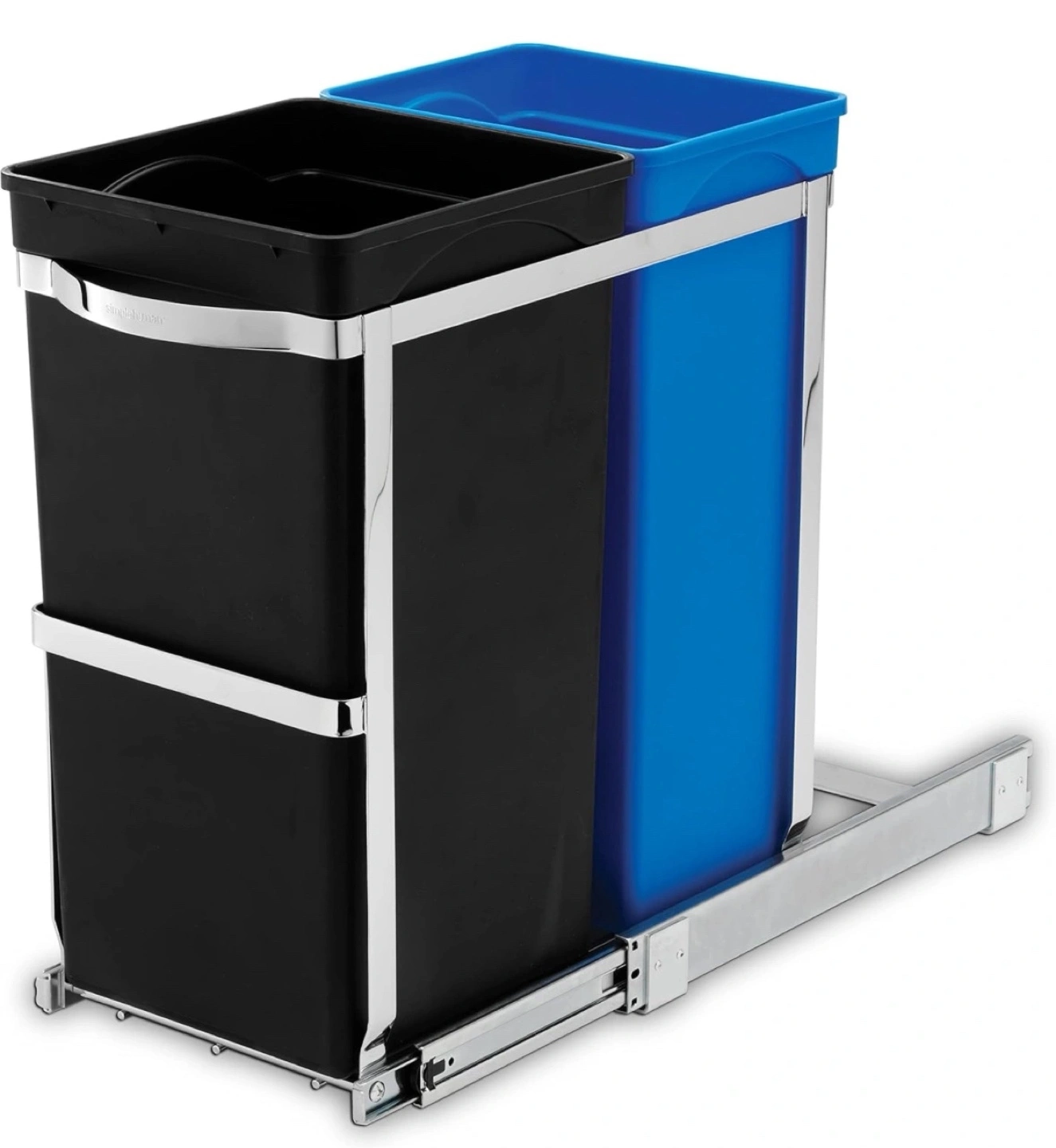 Simplehuman 35 Liter / 9.3 Gallon Dual Compartment Under Counter Kitchen Cabinet Pull-Out Recycling Bin and Trash Can, Chrome A pull-out, two-bin system with a black bin on the left and a blue bin on the right. The black bin has a capacity of 20L and the blue bin has a capacity of 15L. The pull-out system has a full extension slide and includes a soft-close mechanism.