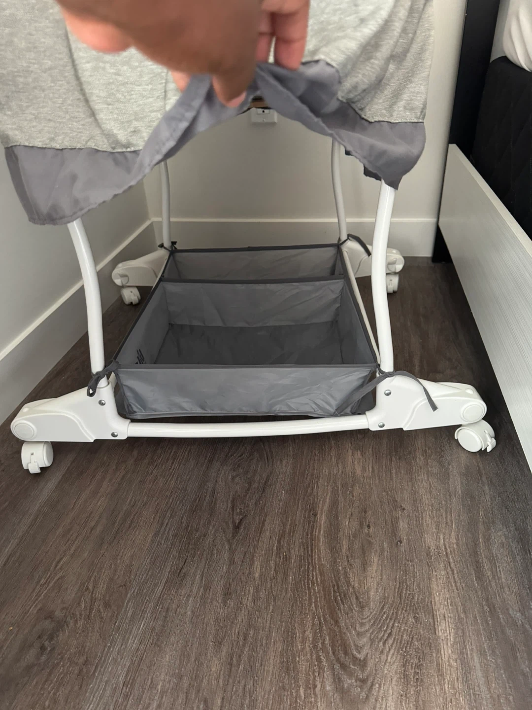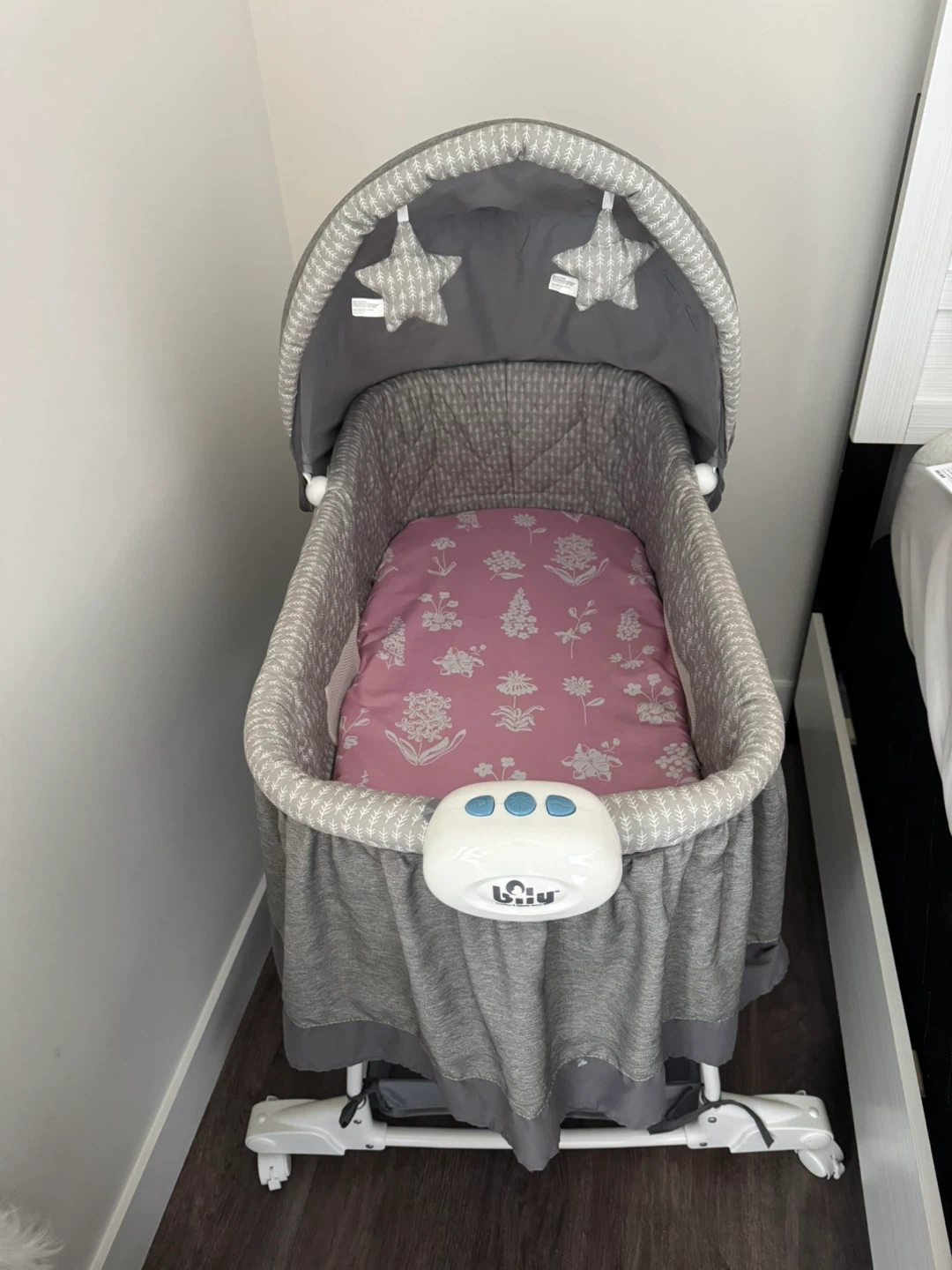 Selling a Simplicity bassinet in great condition! It's grey and has a cute floral pattern on the mattress pad. It also has a storage area underneath for baby essentials. Perfect for newborns!