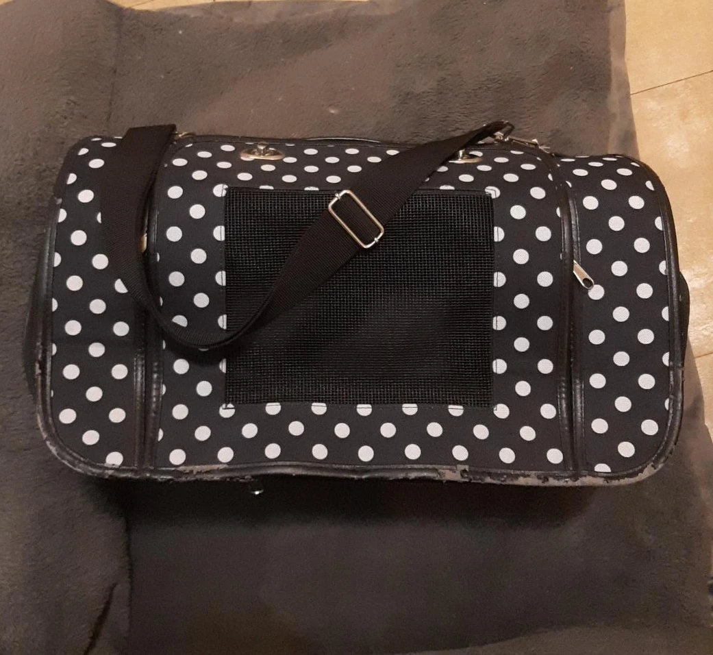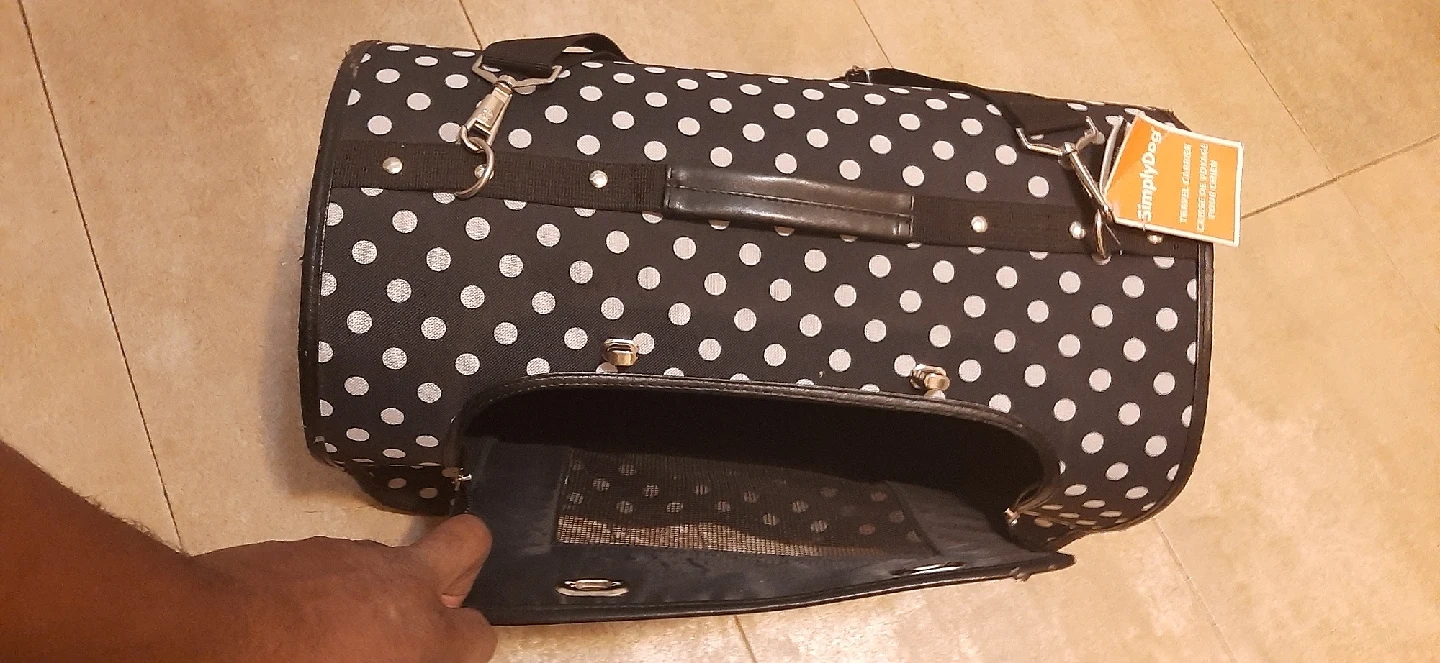 10Selling a gently used SimplyDog pet carrier! It features a cute polka dot pattern and a convenient shoulder strap. Perfect for taking your furry friend on the go. It appears to be in good condition.