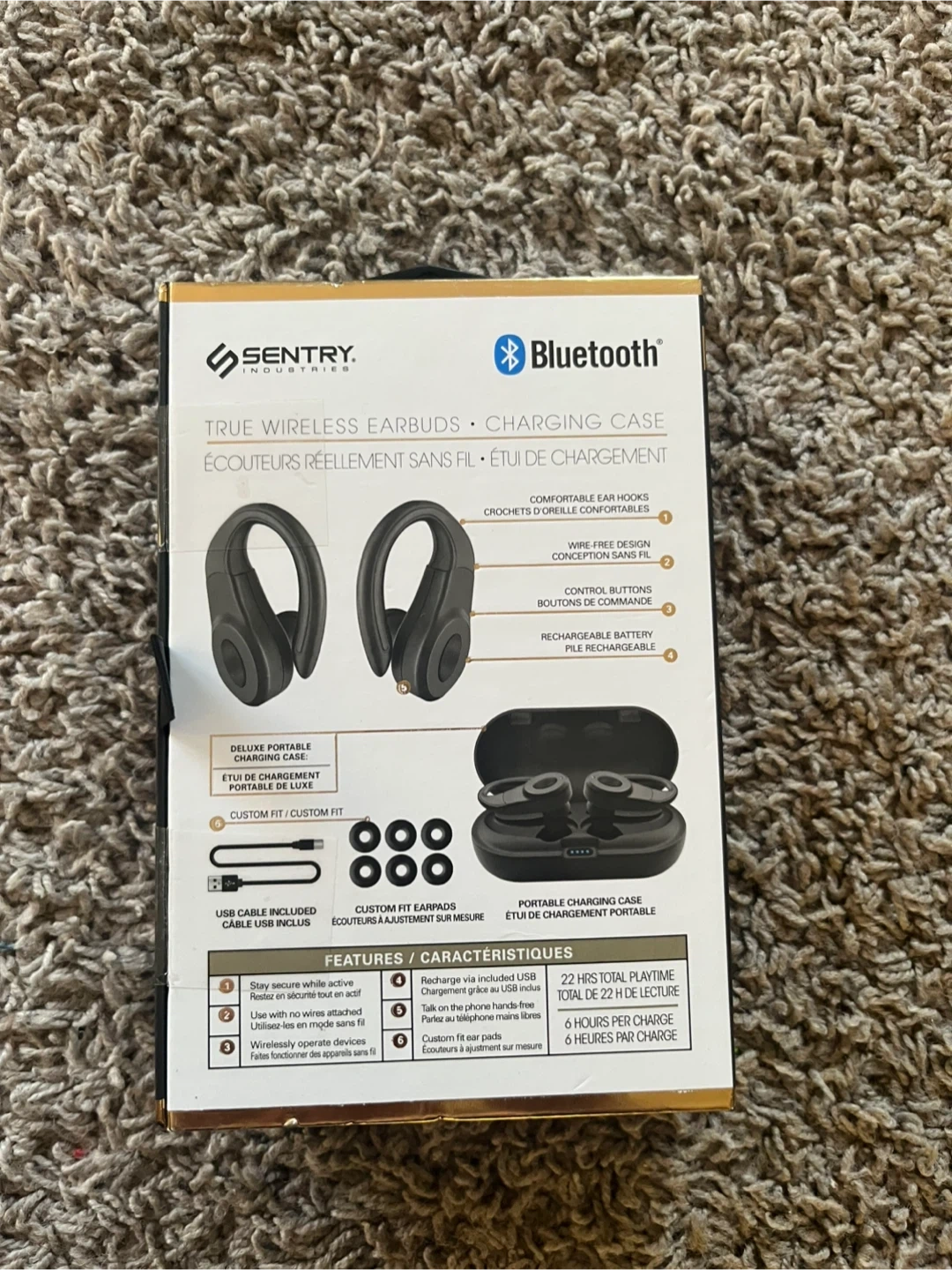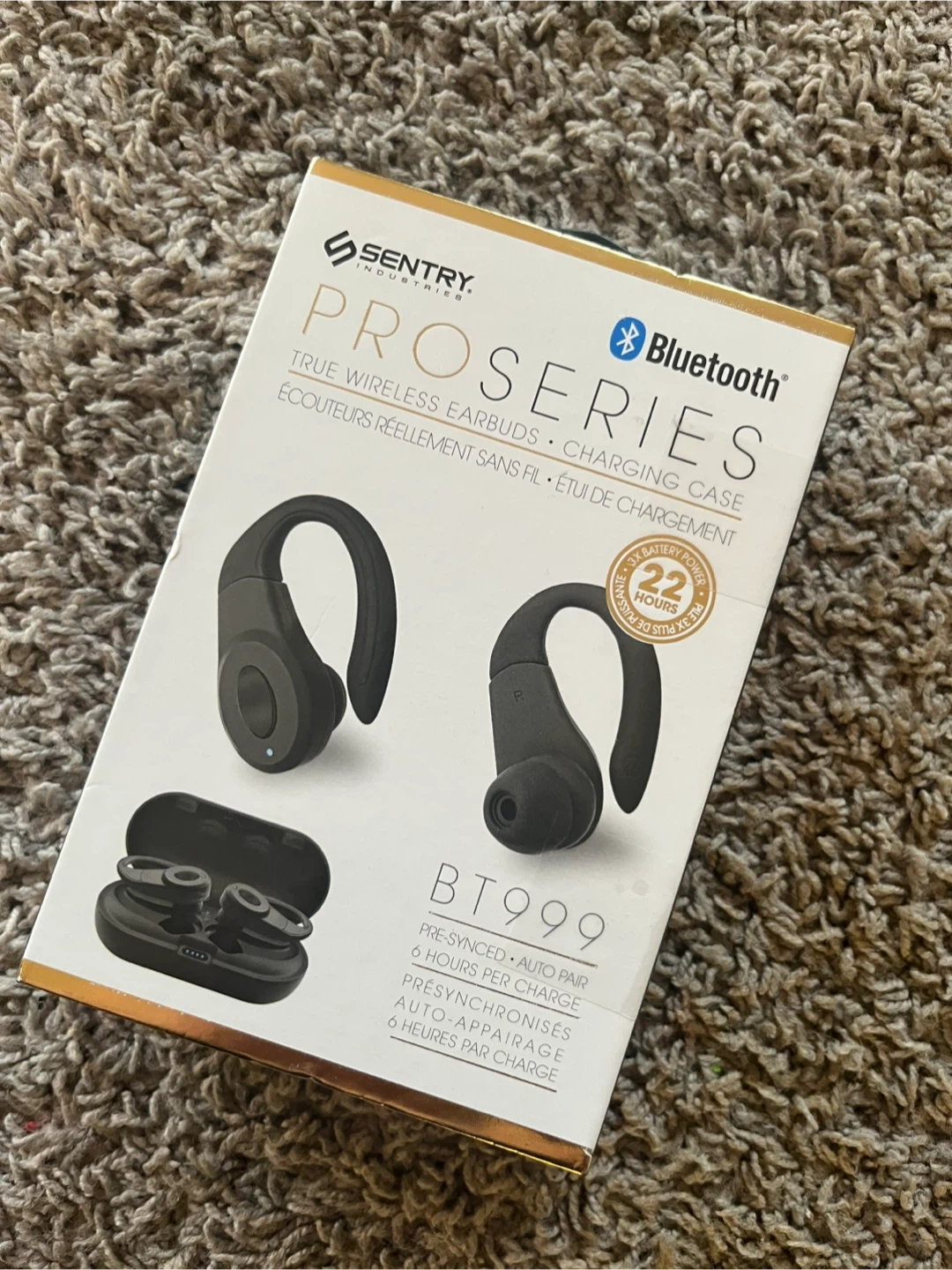 Sentry Industries ProSeries BT999 true wireless earbuds come with a charging case. These earbuds offer 6 hours of playtime per charge and a total of 22 hours with the case. They feature wire-free design and comfortable ear hooks. Includes custom fit earbuds and a USB cable.