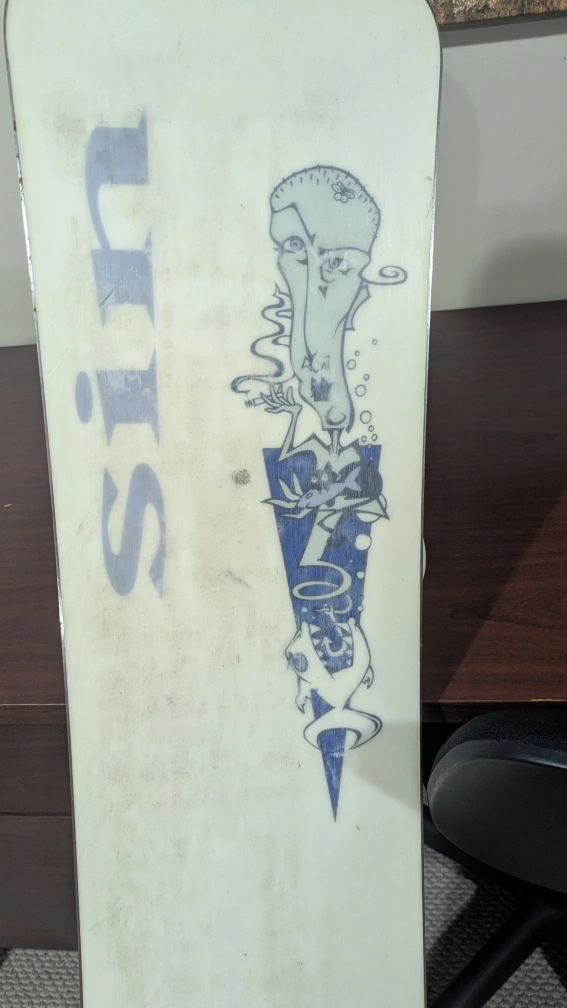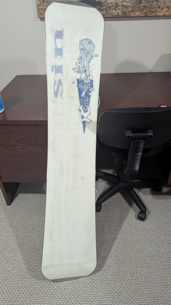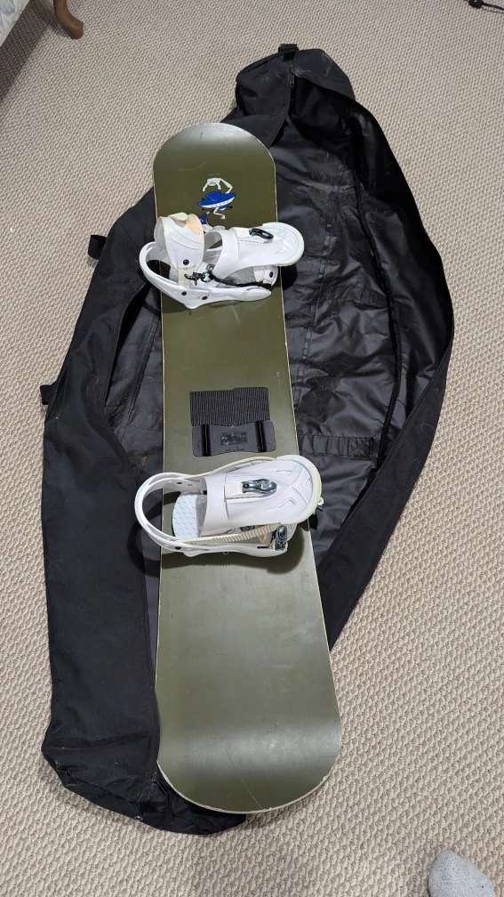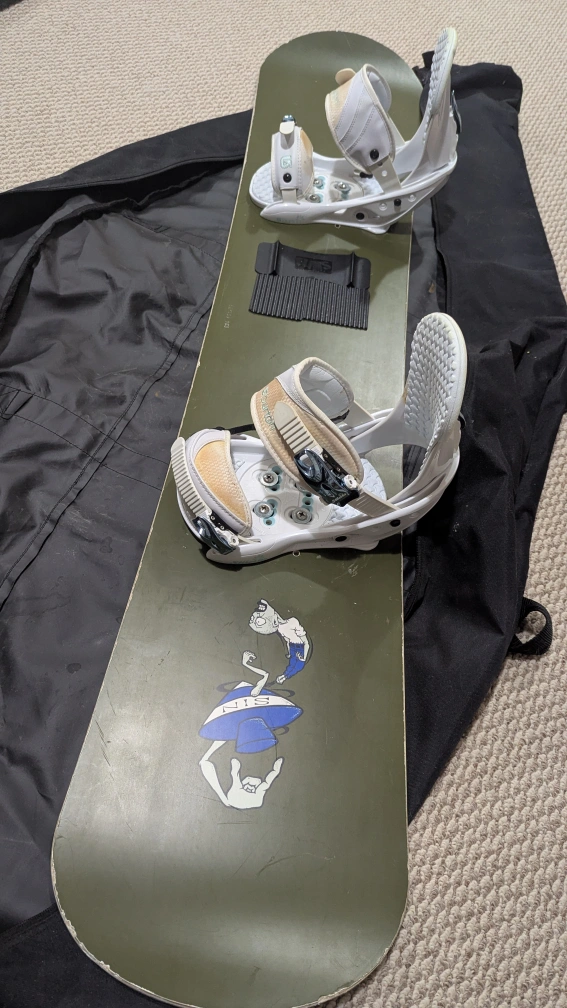 60Selling a used SIN snowboard that comes with Burton bindings and a TekSport carrying bag. It has some wear and tear, but is still in good working condition for hitting the slopes.