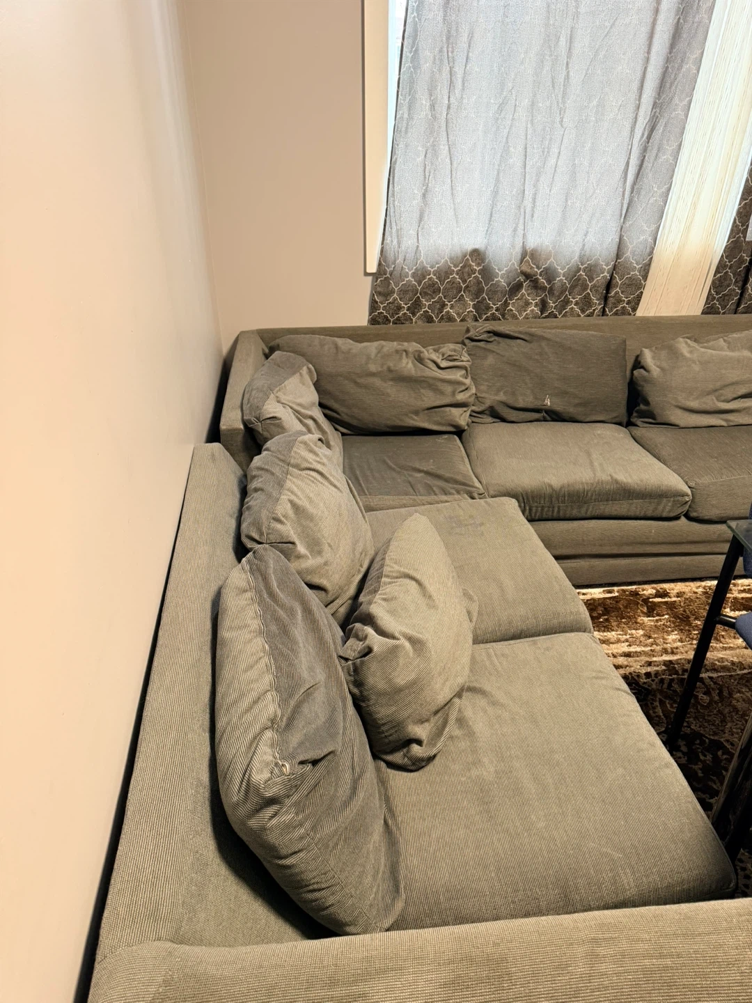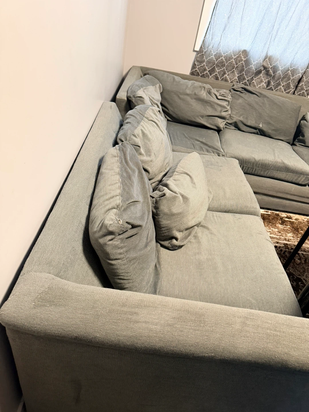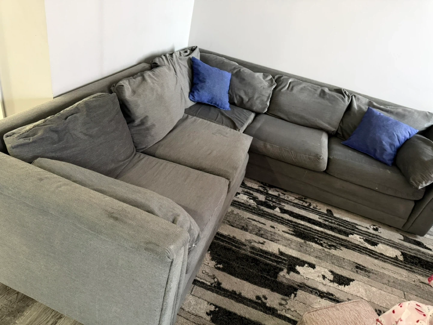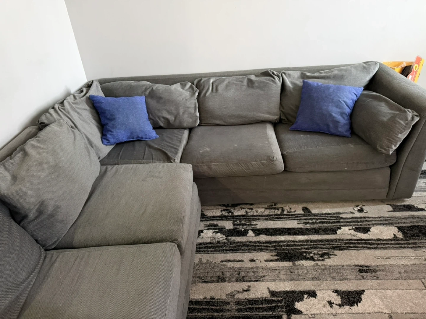 This is a comfortable grey sectional sofa. It comes with two blue accent pillows. The fabric has a corduroy-like texture.has a normal wear and tear. Delivery available at a charge.