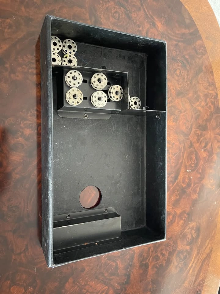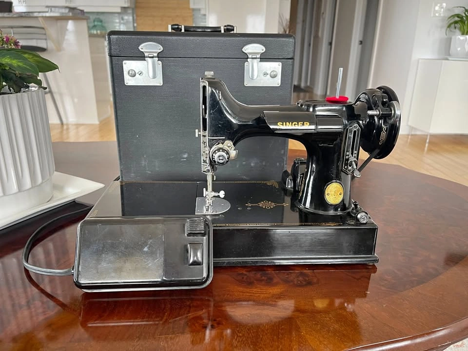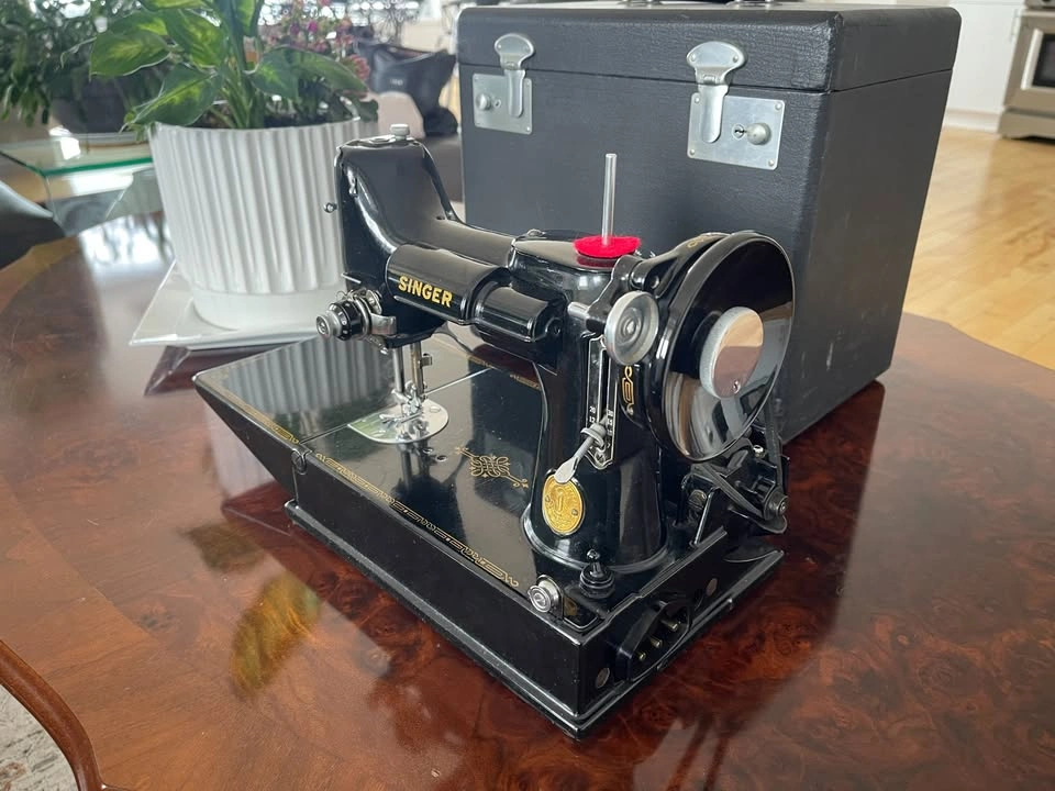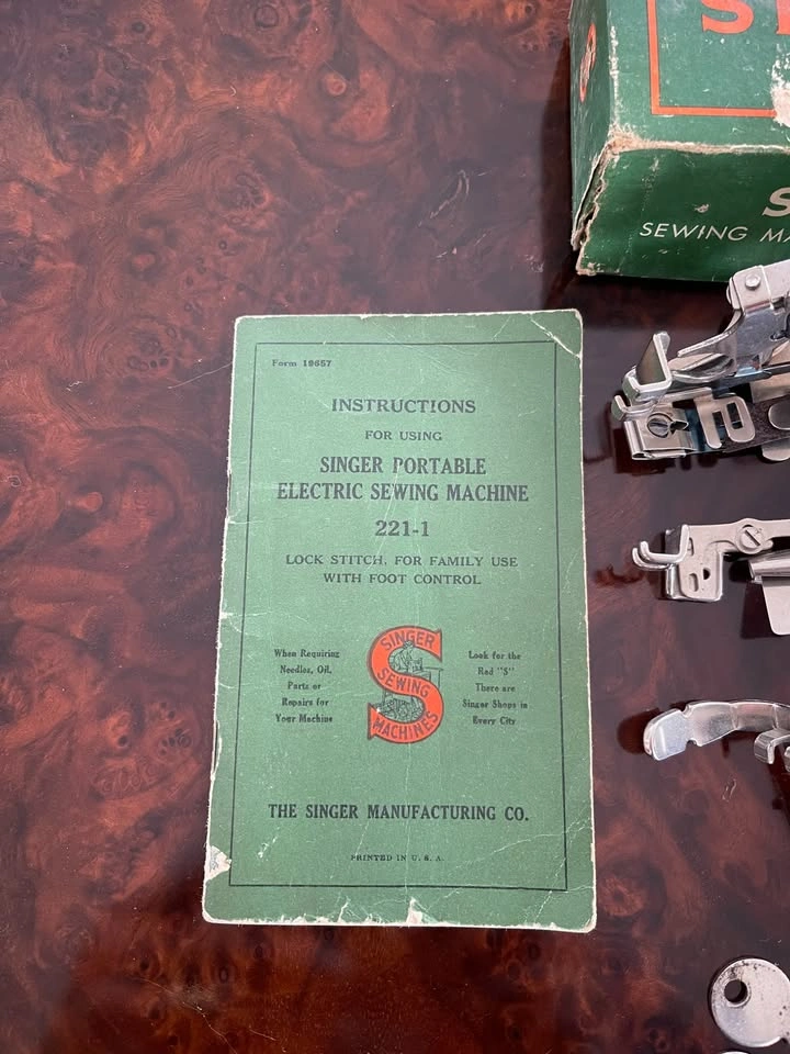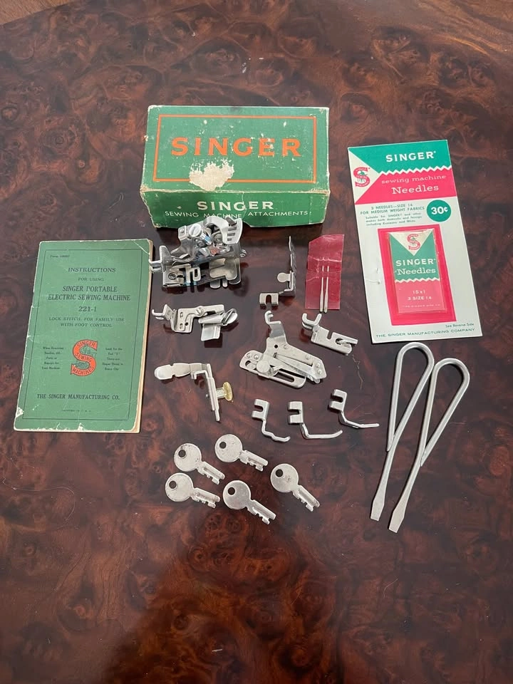 SINGER FEATHERWEIGHT SEWING MACHINE MODEL 221-1, Serial No. AG8146678. Manufactured September 16th 1946. Good working order. This machine includes the case with keys to the locks, tray, foot pedal, instruction booklet, bobbins, extra attachments as pictured, & extra needles. Everything you see pictured is included.