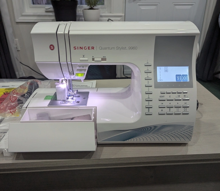 Product details Top highlights BrandSinger ColourWhite MaterialMetal, Plastic Product Dimensions20.8D x 43.7W x 30.5H Centimetres Item weight6.62 kg Power sourceCorded Electric VERSATILE STITCH OPTIONS: The SINGER Quantum Stylist 9960 offers 600 built-in stitches and 1,172 stitch applications, including essential, stretch, and decorative stitches. Use mirror imaging and stitch elongation to create unique designs for quilting, fashion sewing, home décor, and crafts, giving your projects a personalized and professional touch. INCLUDED ACCESSORIES: This machine comes with 19 presser feet, including all-purpose, zipper, buttonhole, button sewing, and satin feet. Additional accessories include bobbins, needles, a seam ripper, lint brush, quilting bar, screwdriver, spool caps, auxiliary spool pin, and a hard protective case, ensuring you have everything you need. TIME-SAVING FEATURES: The built-in automatic needle threader threads the needle in seconds, minimizing setup time. The top drop-in bobbin system with a transparent cover allows for easy monitoring of thread levels, helping you avoid running out of thread mid-project and ensuring smooth sewing without unnecessary interruptions. PRECISION AND PERSONALIZATION: With 13 fully automatic one-step buttonhole styles, including keyhole designs, this machine ensures consistent, professional buttonholes. The built-in lettering font makes it easy to personalize your work with monograms and custom text, allowing you to add creative, unique touches to your garments and projects. CONVENIENT CONTROLS FOR EASY SEWING: Adjust the sewing speed to suit your project, whether you prefer a slow pace for precision or a fast pace for efficiency. Use the start/stop button to sew without a foot pedal, giving you greater control, especially for large quilting projects or complex stitching tasks that require a steady hand. EXPANDED WORKSPACE WITH BRIGHT LIGHTING: The included extension table provides ample space for large projects like quilts, offering room to manage fabric comfortably. Bright LED lighting illuminates your workspace, making it easy to work on intricate details and ensuring that you maintain accuracy during long sewing sessions. HIGH-SPEED PERFORMANCE & ADVANCED FEATURES: With a maximum sewing speed of 850 stitches per minute, you can complete projects quickly without compromising quality. The needle up/down function is perfect for pivoting fabric at corners, while the twin needle setting allows for decorative stitching, enhancing your creative possibilities. REVERSE LEVER: Press and hold to sew stitches in reverse to easily secure seams. ADJUSTABLE THREAD TENSION: Fine tune stitches as needed for fabric, thread or sewing technique.
