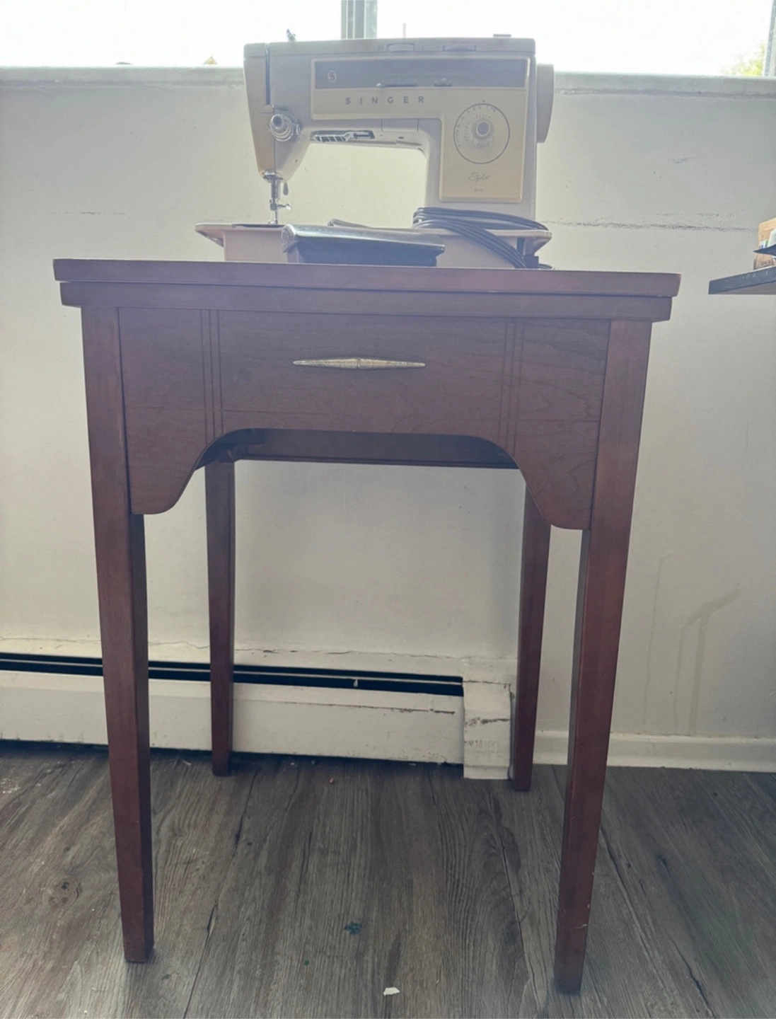 188This vintage Singer sewing machine and table is a delightful find for any sewing enthusiast! The Singer Stylist 513 is a classic model known for its reliability. The sewing machine is in used condition and has been well-maintained. It comes complete with its original table, which not only provides a sturdy base but also adds a touch of retro charm to any room. * Model: Singer Stylist 513 * Includes: Original sewing machine table * Condition: Used, no idea if it works. May need to be fixed. You are buying this knowing that you may need to fix it up. This set is perfect for those who appreciate vintage craftsmanship or are looking for a dependable sewing machine If the ad is up, it’s available. TEXT 226-979-2236 for fastest response