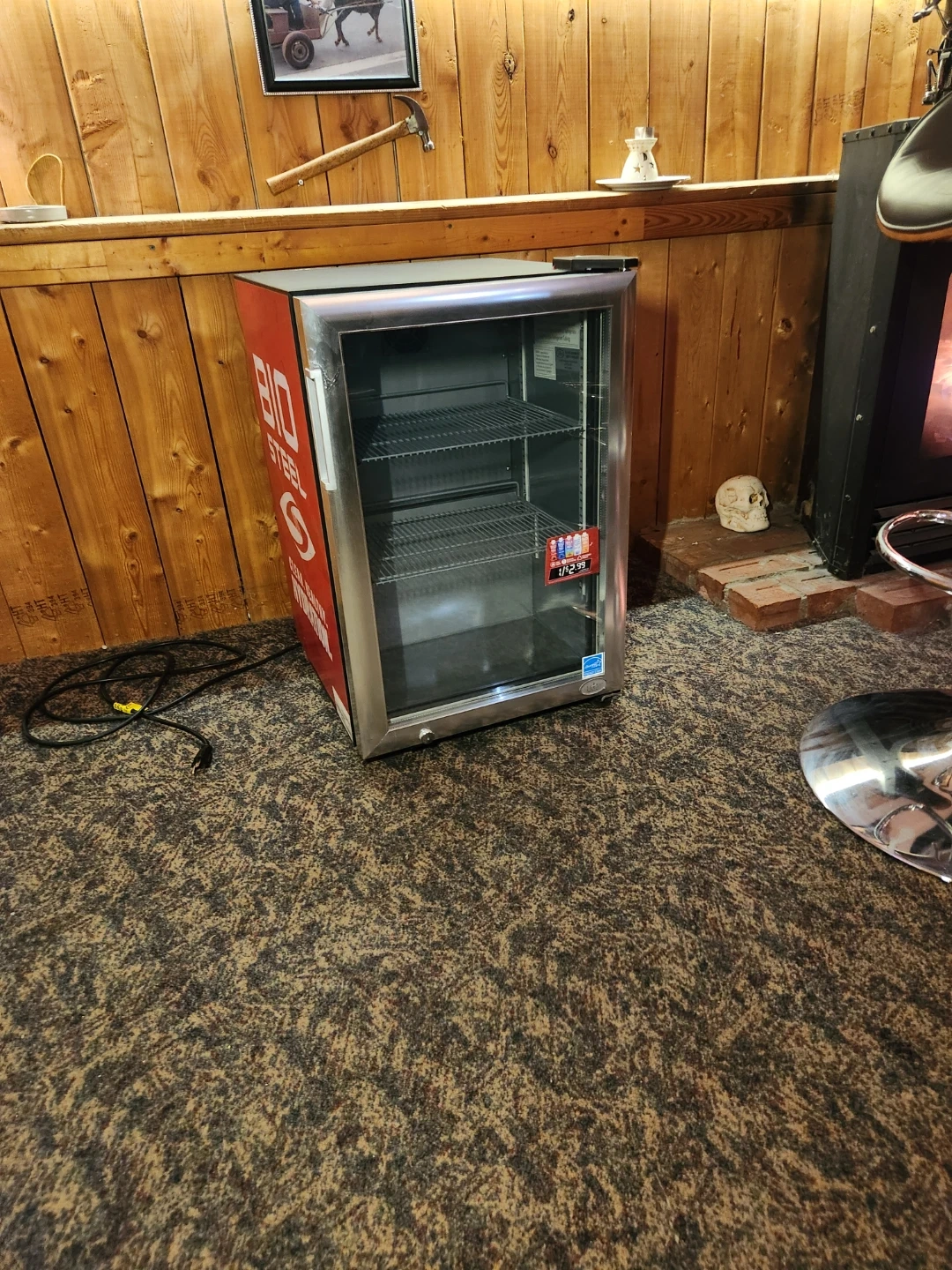 This is a Bio Steel mini fridge. It's a compact cooler with three shelves. Includes interior lighting and a glass door.