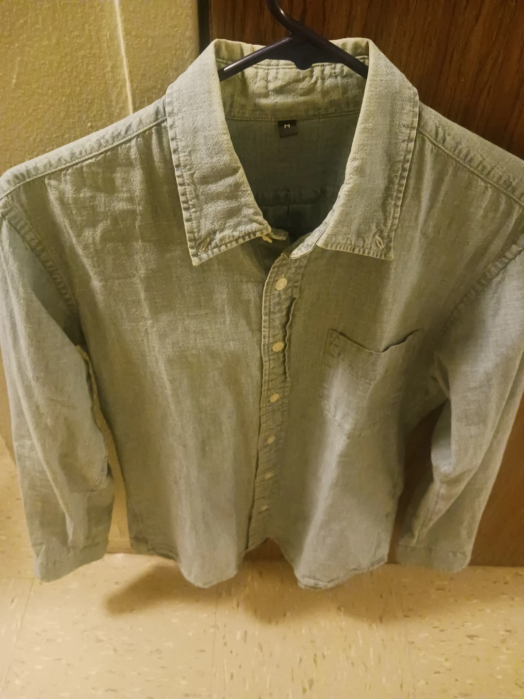 long sleeve button-down shirt features a classic collar and a single chest pocket. It's made from a lightweight, textured fabric. This shirt is suitable for casual wear.