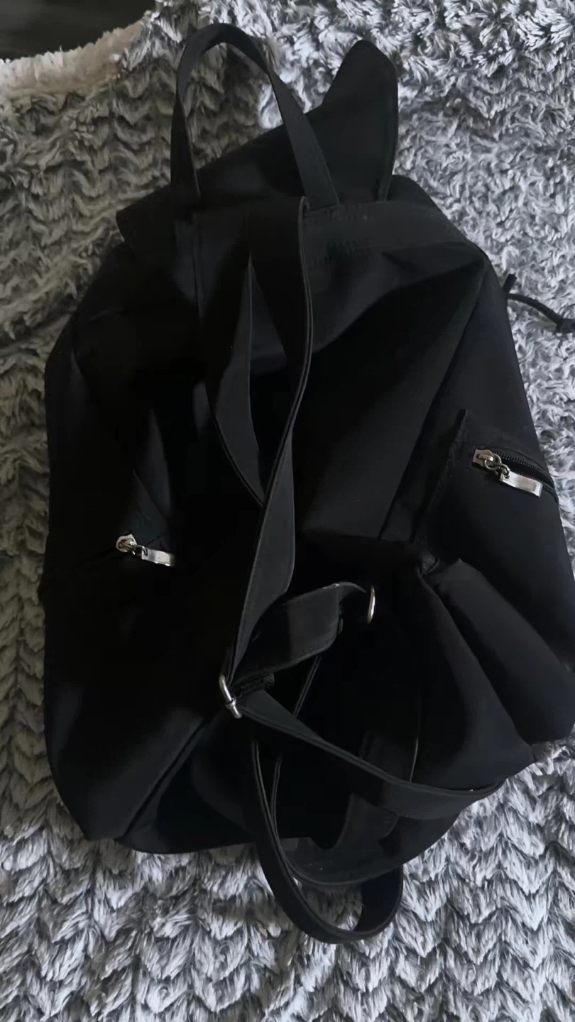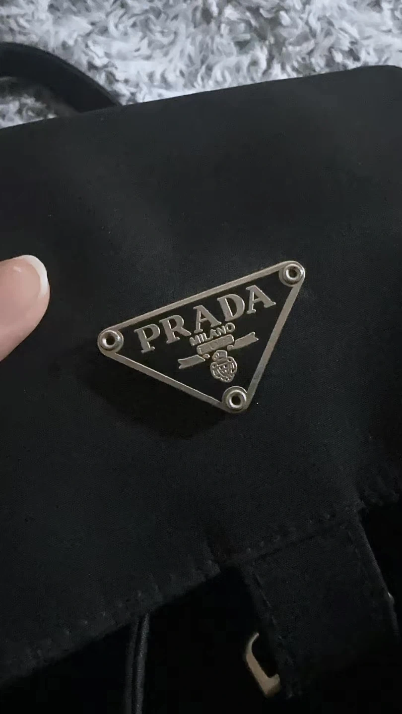 This is a black Prada backpack made from nylon. It features a drawstring closure and multiple exterior pockets. The iconic Prada logo is visible on the front.