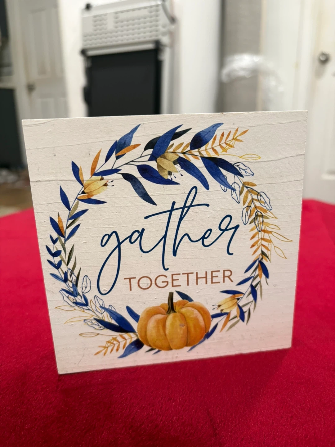 Three decorative wooden blocks featuring inspirational quotes and autumn-themed designs. One block reads "A thankful heart is a happy heart." Another states "Have hope in your heart, faith in your future, love in your soul." The third says "gather TOGETHER" with a pumpkin graphic. Made in the USA.