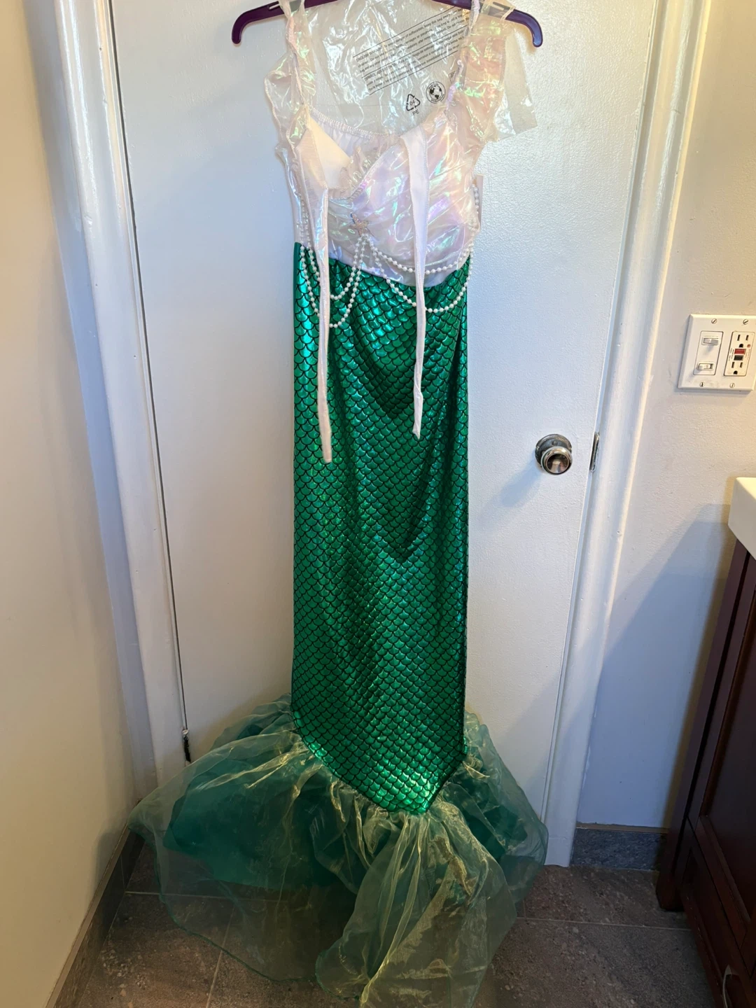 Get ready to make a splash with this Siren Mystique mermaid costume! It's a size small (4-6). The costume features a beautiful iridescent top, a green scale-patterned skirt, and comes with a headpiece. Perfect for Halloween or costume parties! Never worn!