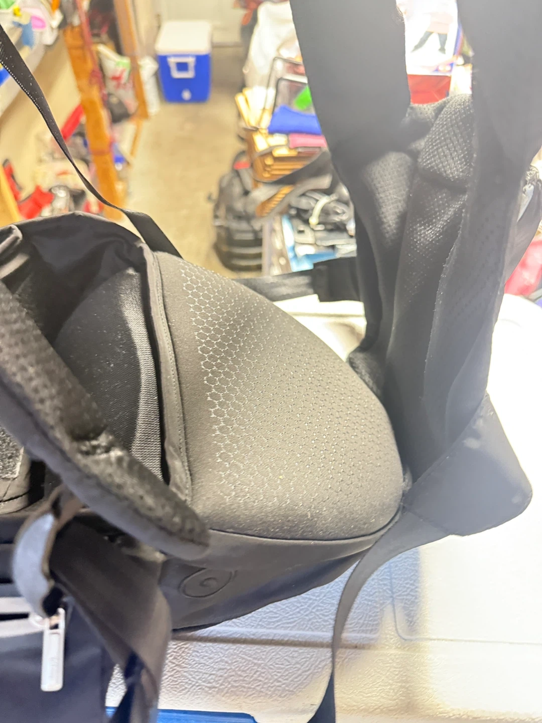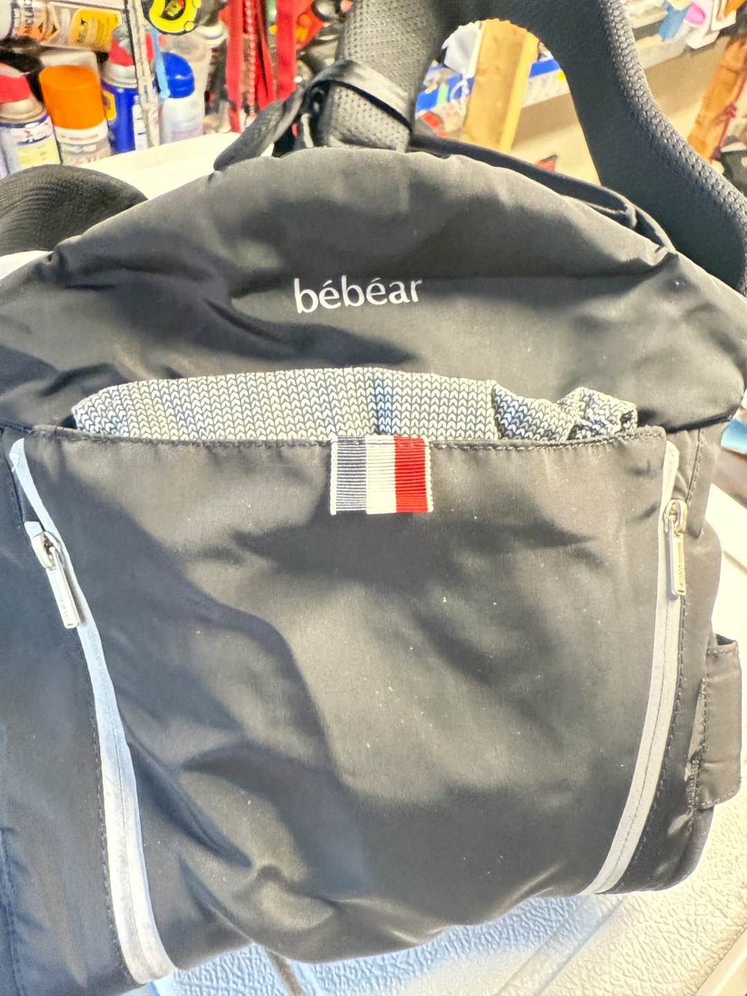 Selling a Bébéar baby carrier in black. It features a stylish design with a comfortable padded interior for baby's comfort. The carrier also has multiple pockets for storage and adjustable straps for a secure fit. Perfect for keeping your little one close while on the go!