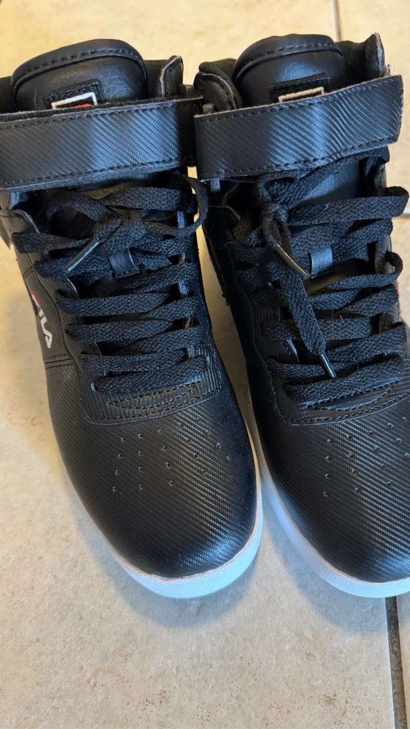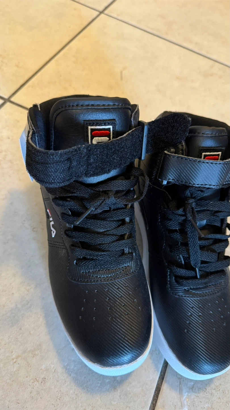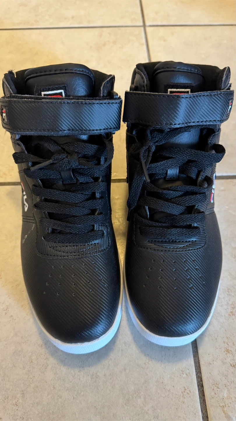 These Fila high-top sneakers , brand new and ready for a new adventure! They're black with a cool high-top design and feature the iconic Fila logo. Size 6