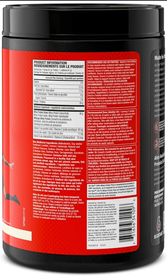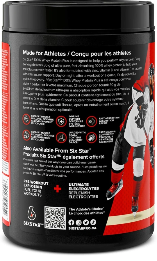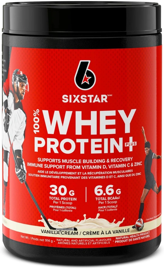 Six Star 100% Whey Protein Plus in Vanilla Cream flavour! It's formulated with vitamin D and vitamin C to provide immune support and helps muscles recover faster. It supports muscle building and recovery, containing 30g of protein per scoop. Great for athletes looking to boost their performance!
