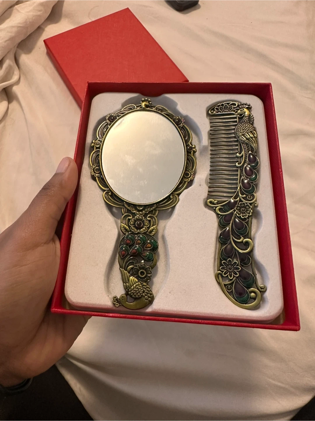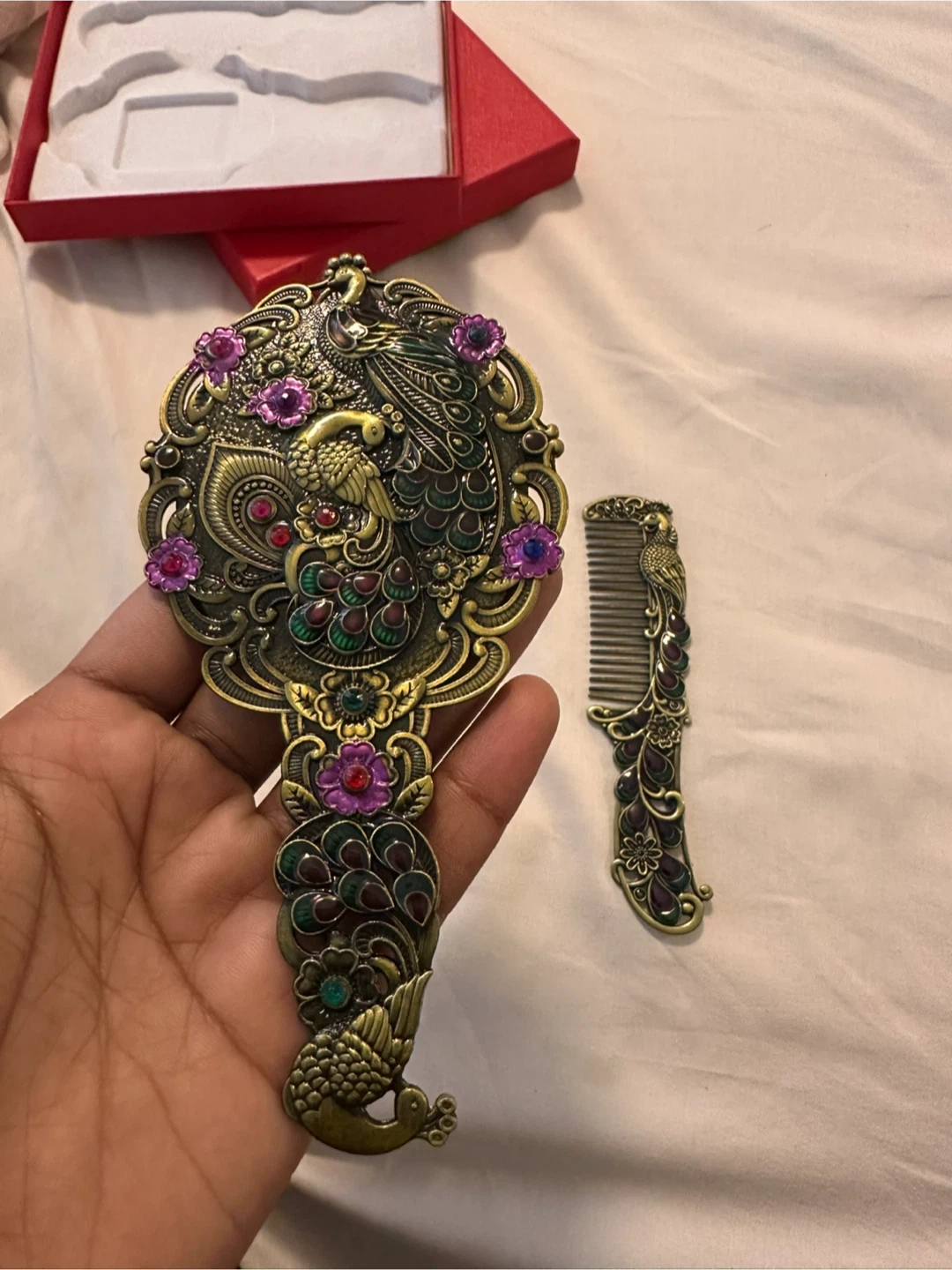 This is a vintage-inspired peacock mirror and comb set. It's crafted with intricate details and a beautiful antique bronze finish. The set includes a handheld mirror and a matching comb.