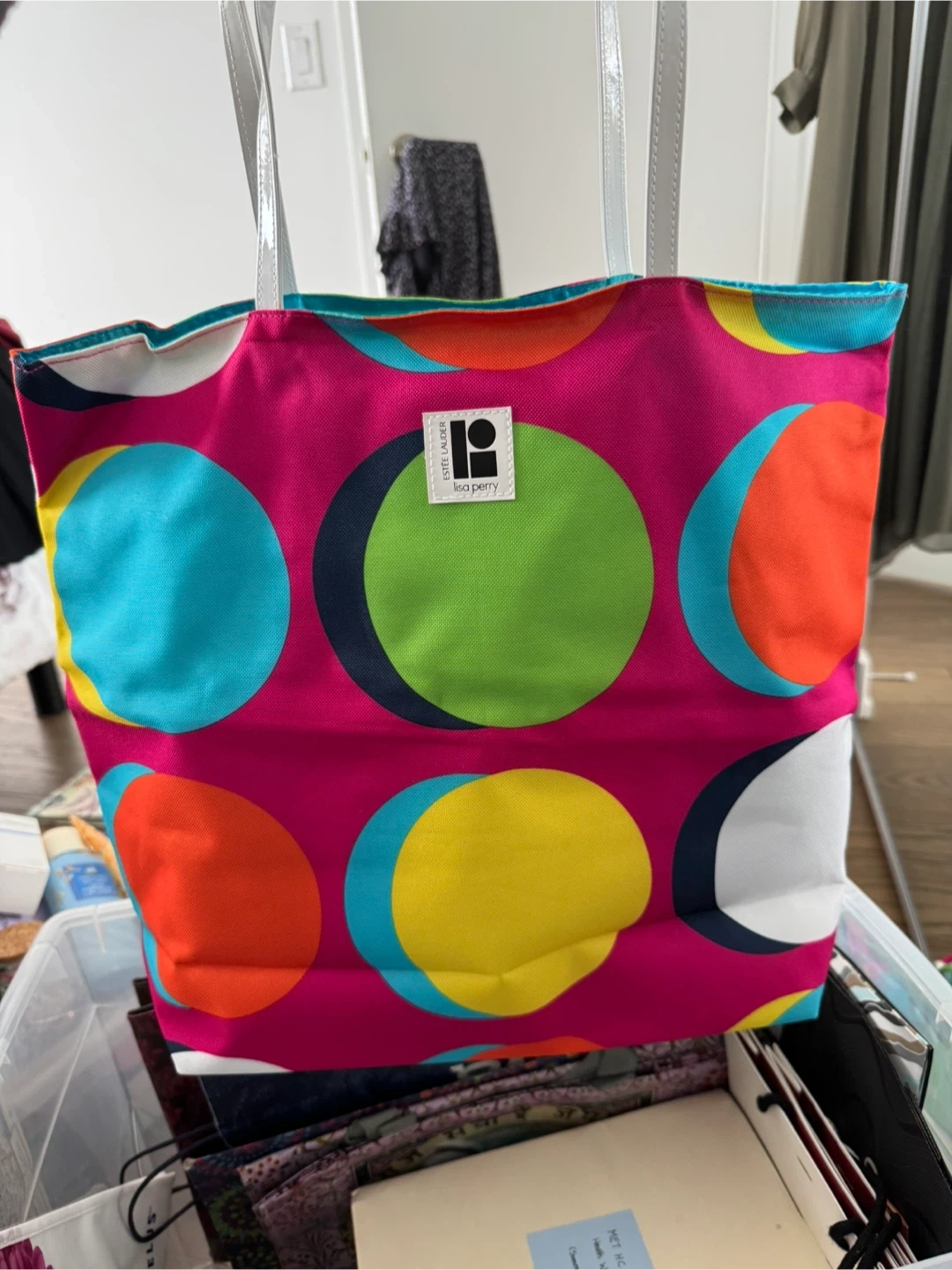 Bright and colourful tote bag with a geometric circle pattern. It features a vibrant pink exterior with a contrasting blue interior lining. This bag is perfect for everyday use, carrying groceries or as a beach tote!