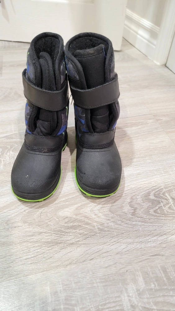 Selling a pair of kids' winter boots in size 12. They're black with a bit of a camo pattern and a bright green sole. Perfect for keeping little feet warm and dry this winter!