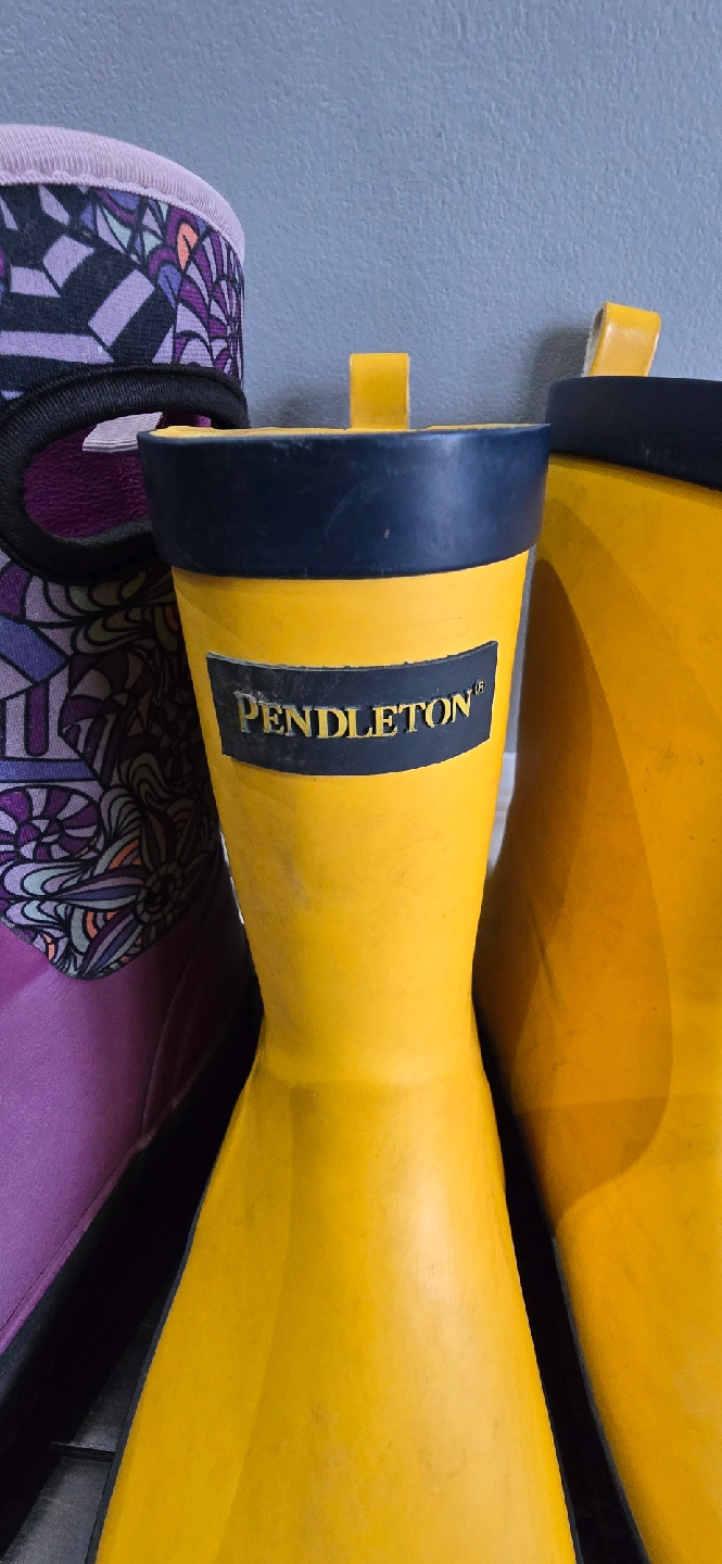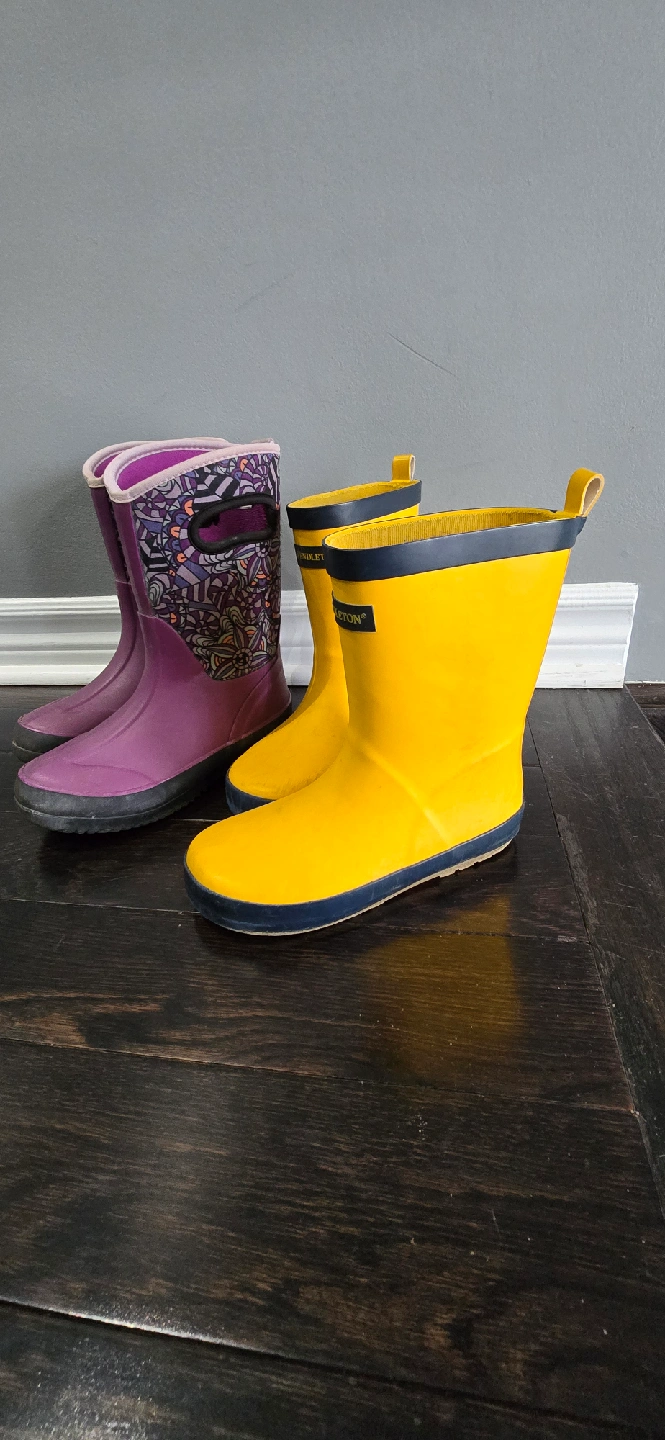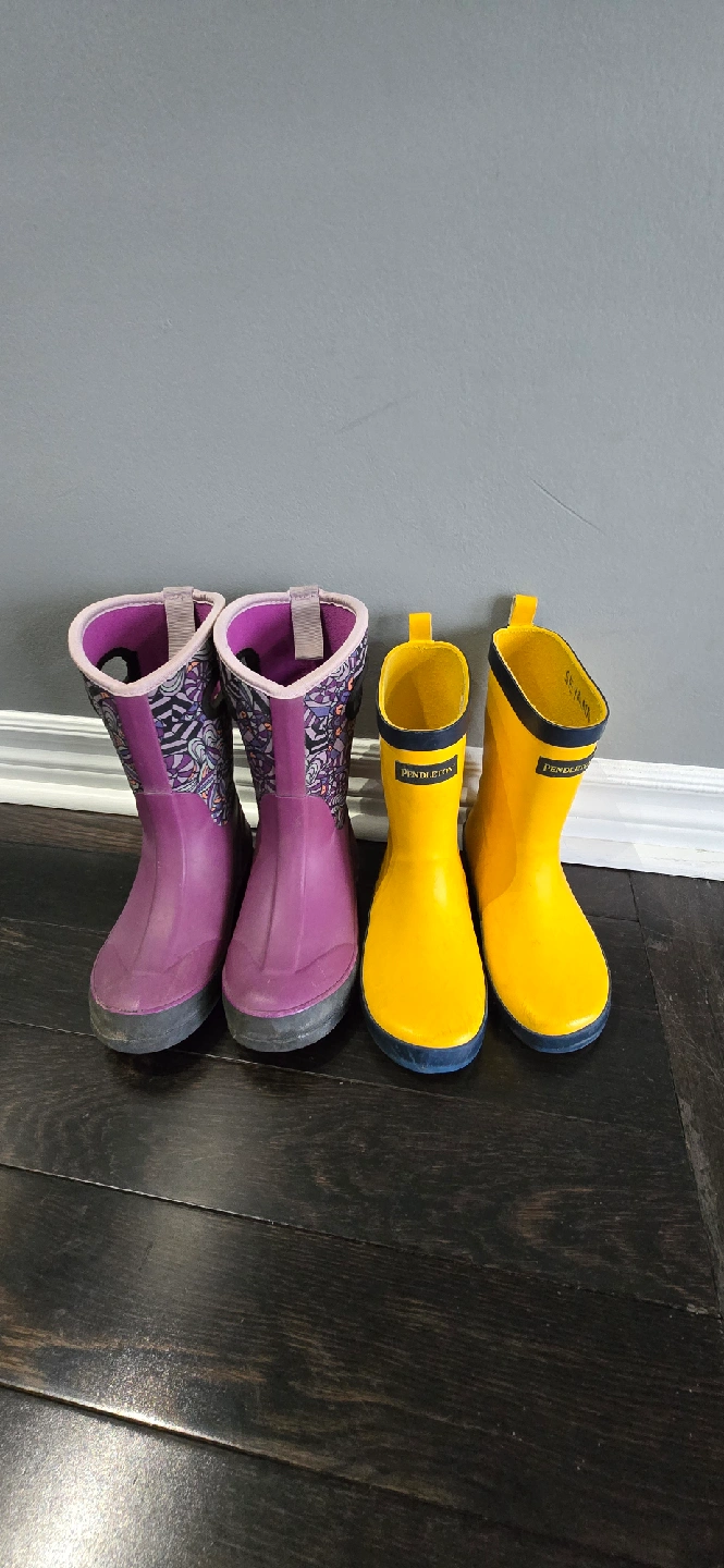Used for 1 season - child outgrown both Price: Purple - winter boots $15 Yellow - rain boots $15 Both for $25 Pickup: Brock and Taunton-Whitby Kids rain boots