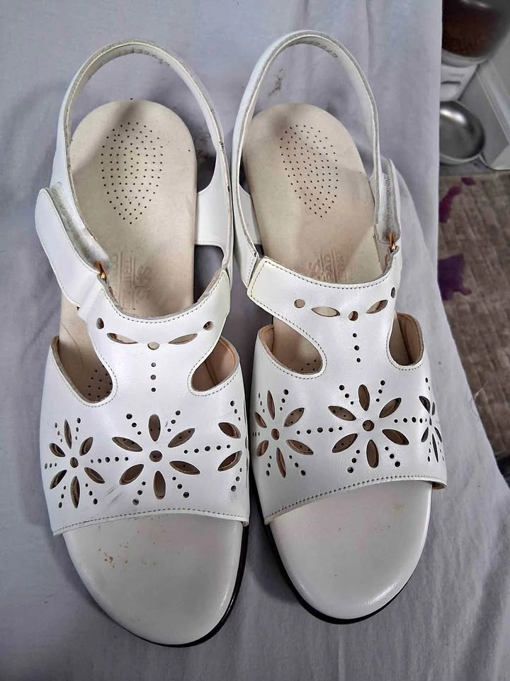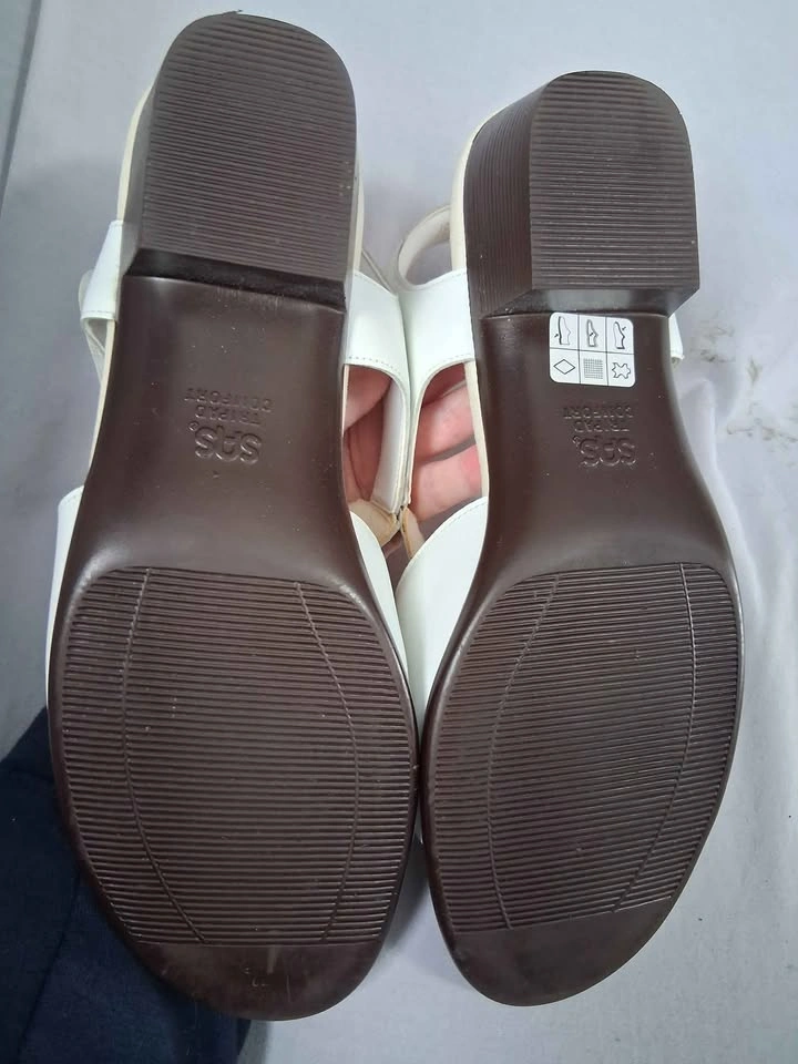 Women's size 9.5 white leather sandals with velcro strap, low heel, and comfort foot bed. Brand is SAS, made in USA. Pick up in south Ajax.
