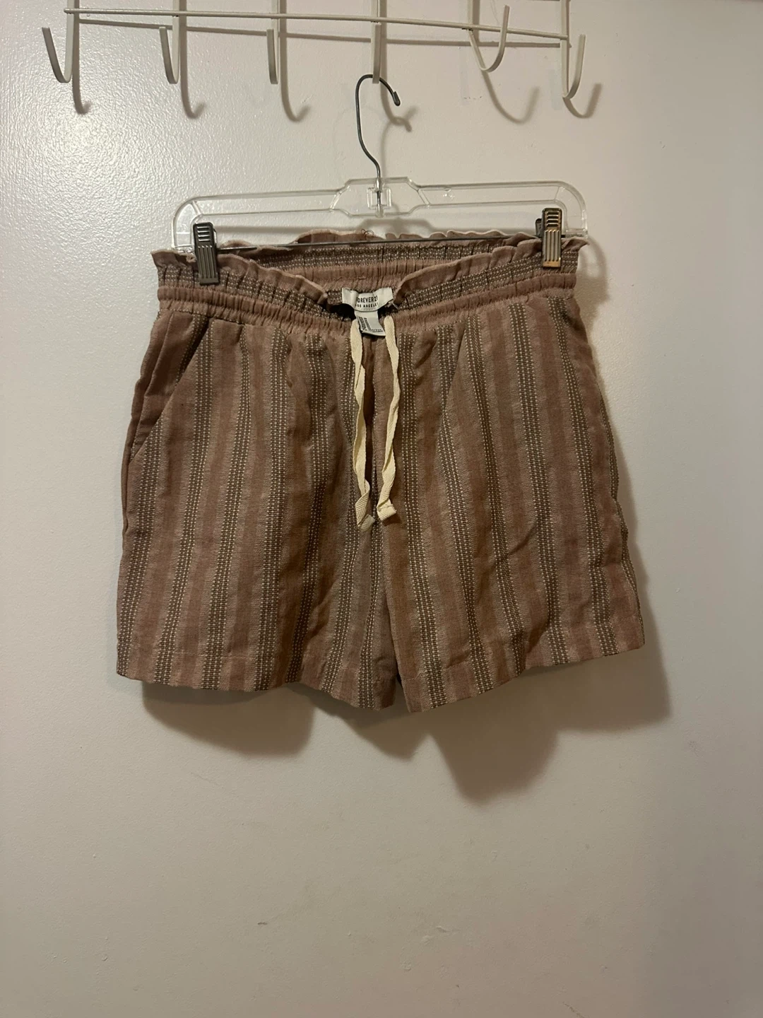 10These cute shorts are a size medium and feature a stylish striped pattern. They have a comfortable elastic waistband with a drawstring. Perfect for casual wear!