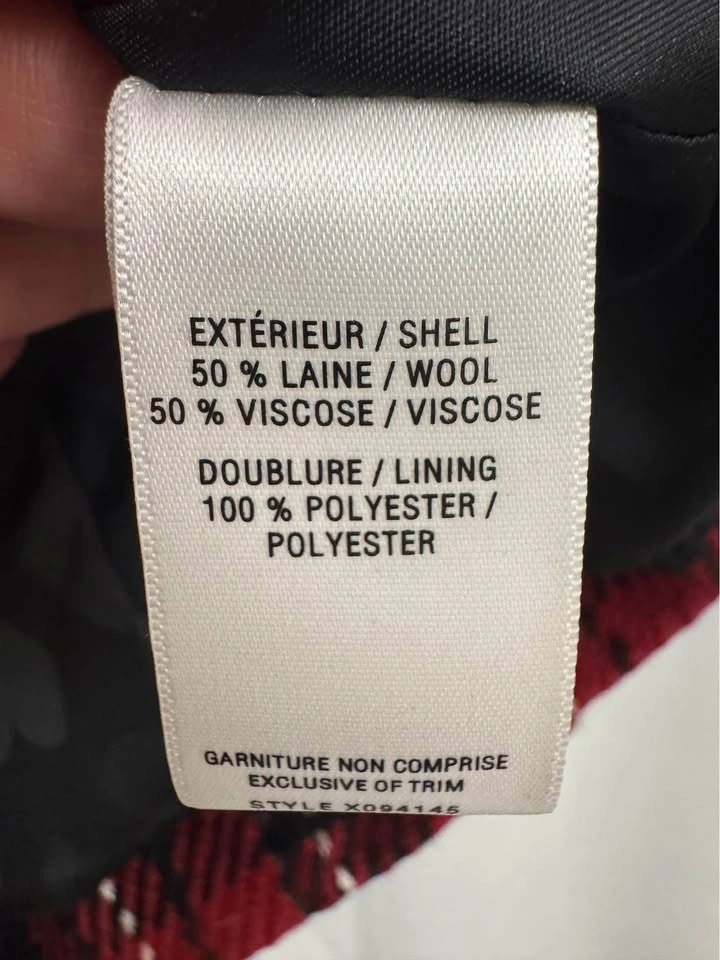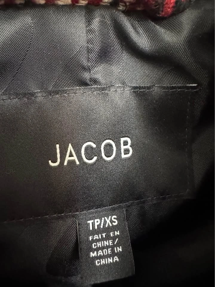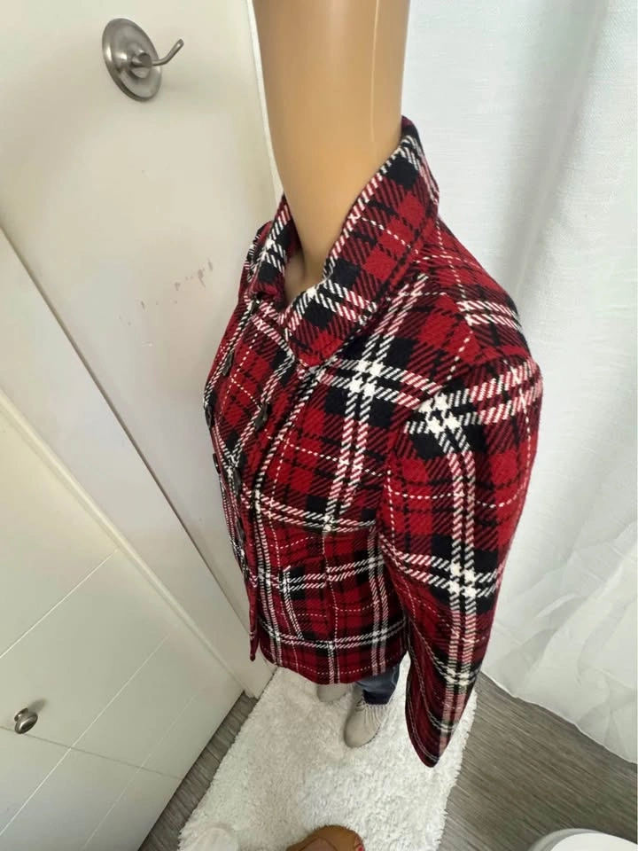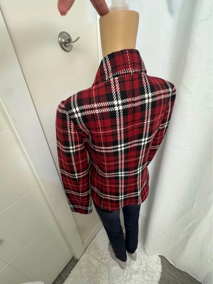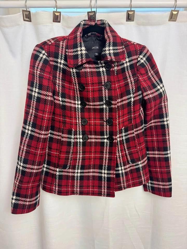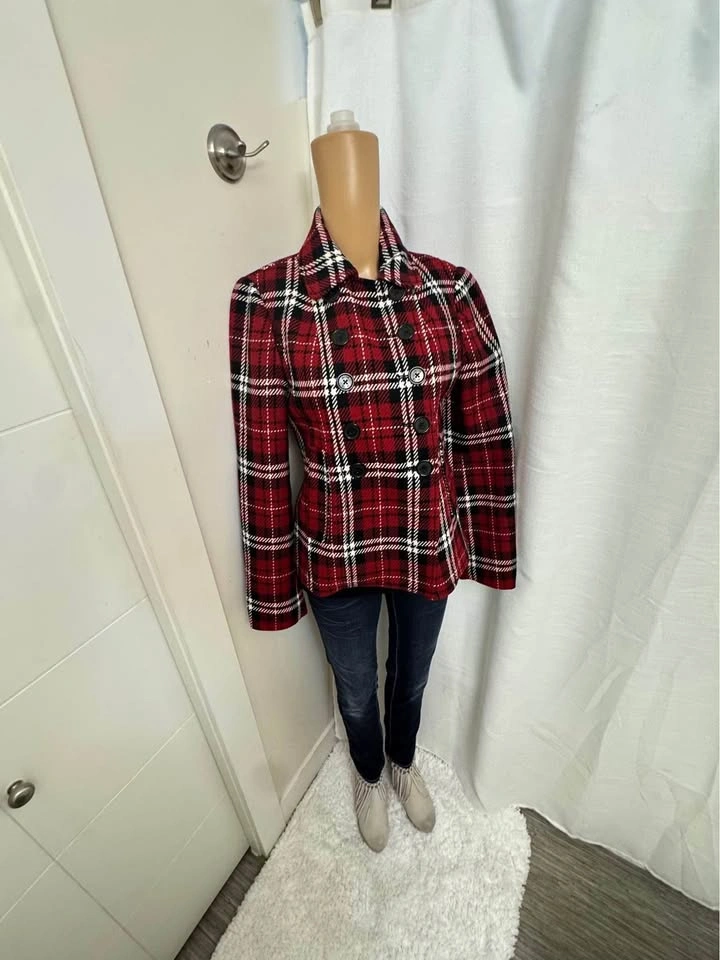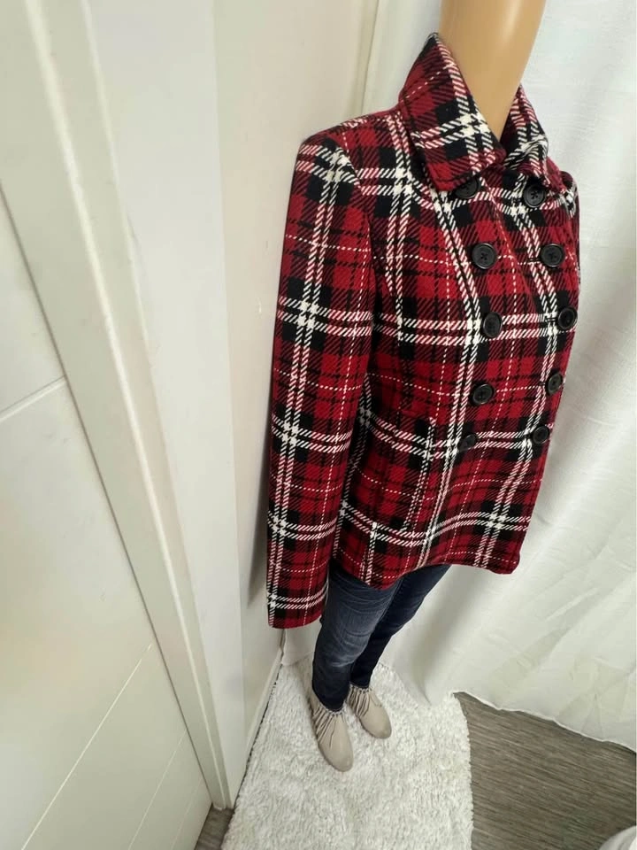Size XS Chic red plaid pea coat with double-breasted design. Perfect for stylish outings. 18 inches length is 23 inches. I invite you to join my Facebook group called ROCK ON. I paint rocks and hide them around for you to find.