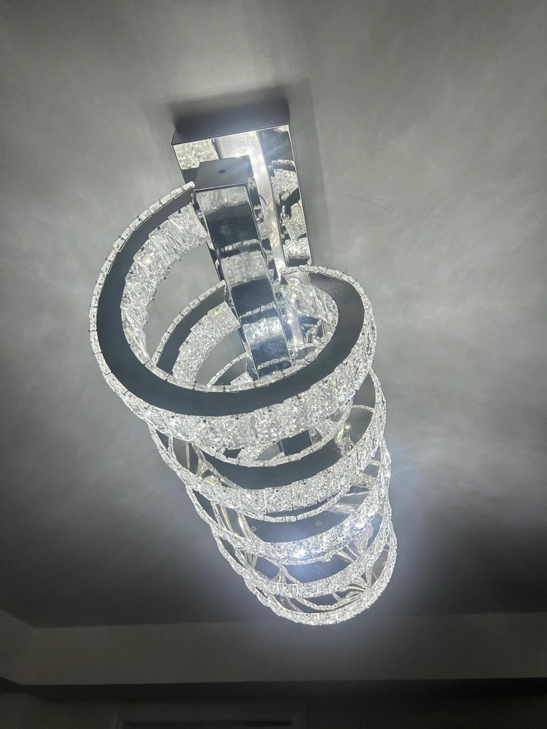 A striking modern chandelier featuring multiple crystal-encrusted spiral rings suspended from a rectangular chrome base. It has a sleek, contemporary design that adds a touch of glamour. Perfect for illuminating a dining room or living space!
