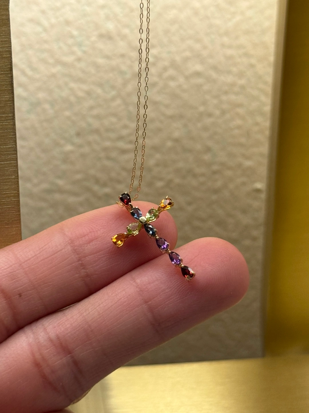 Beautiful 18k gold necklace. Features a cross pendant adorned with colourful gemstones. 0.65ct total gemstone weight. Delicate gold chain.