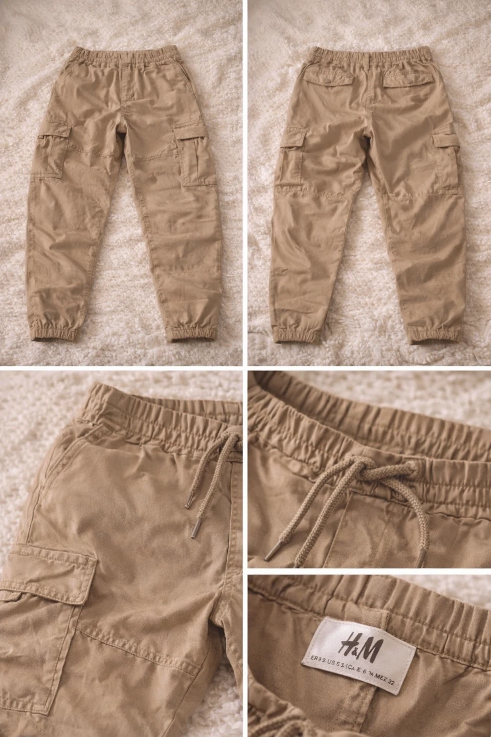 These are H&M cargo pants in a tan colour. They have an elastic waistband with a drawstring and cuffed ankles. Material is a cotton blend.
