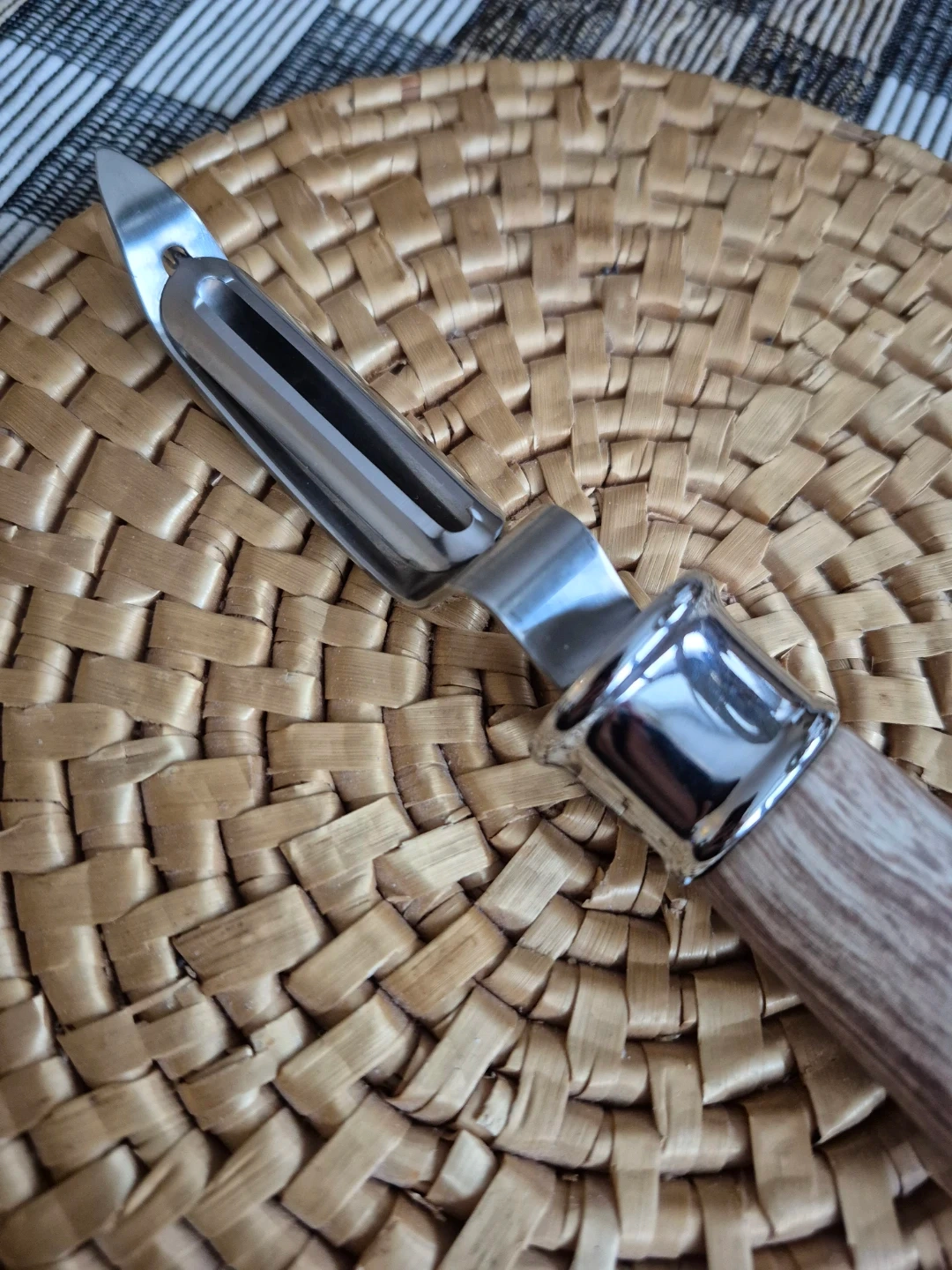 High quality comfort grip peeler with a chubby handle in a soft material that's easy and pleasant to grip. It's made to look like wood (but feels softer) and says "PEEL" on it.