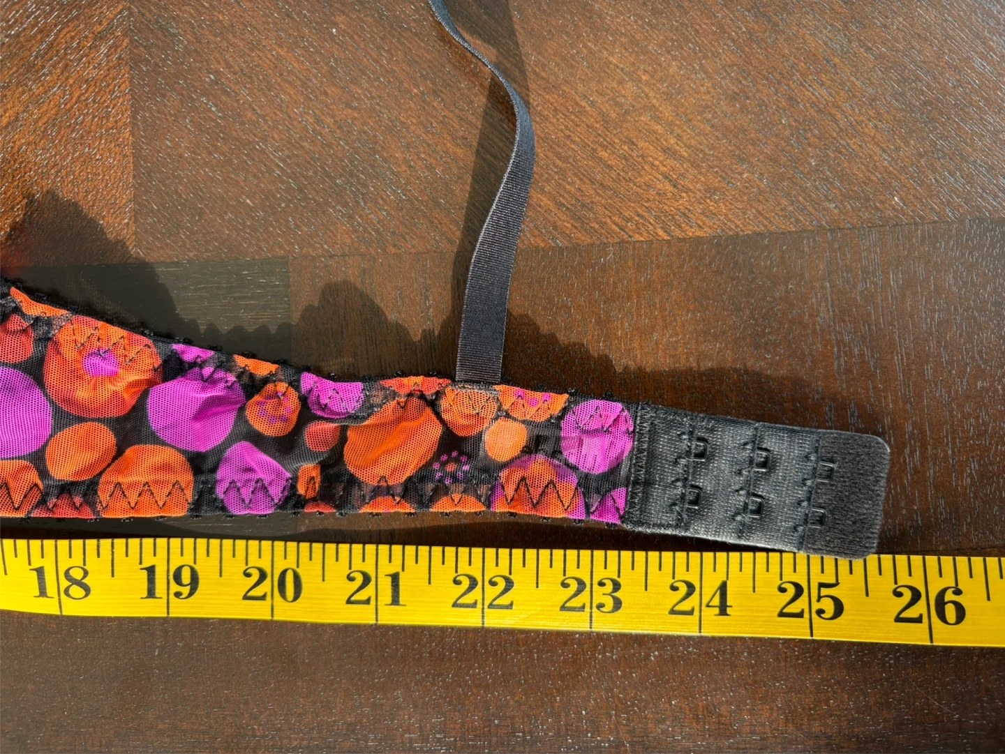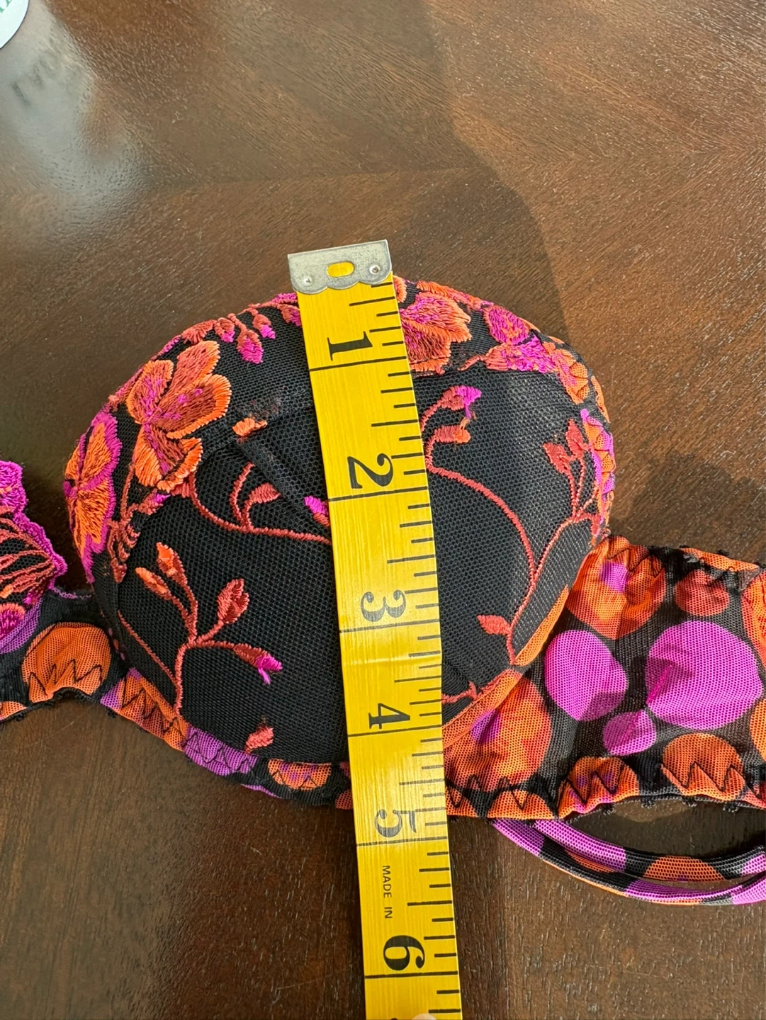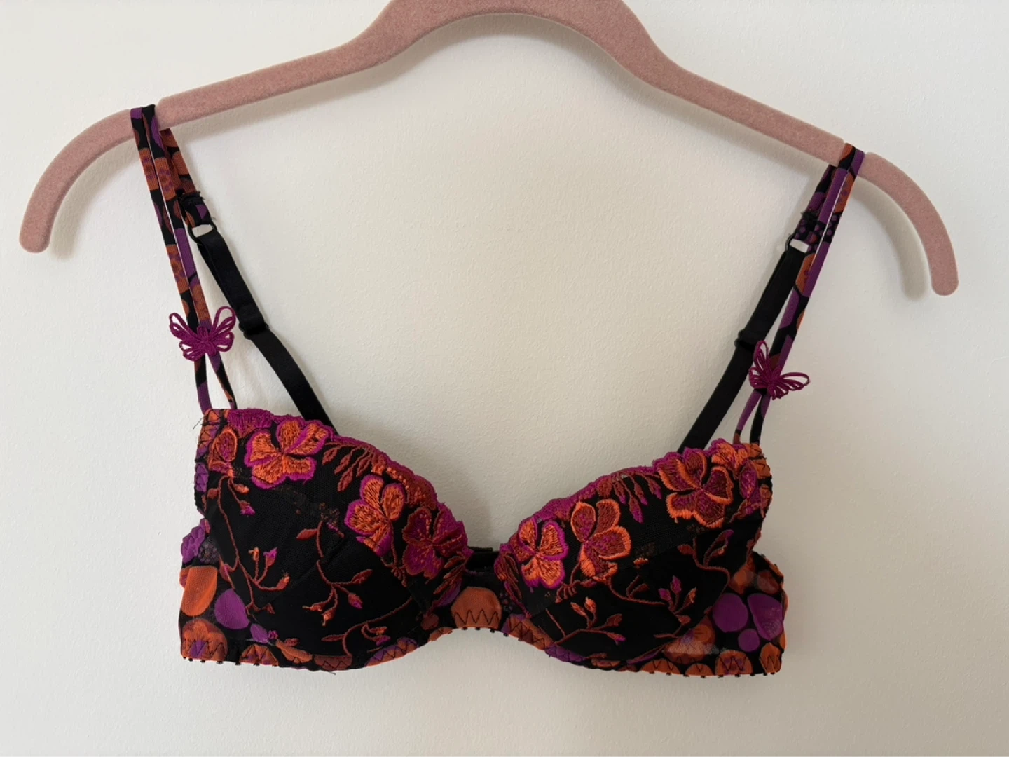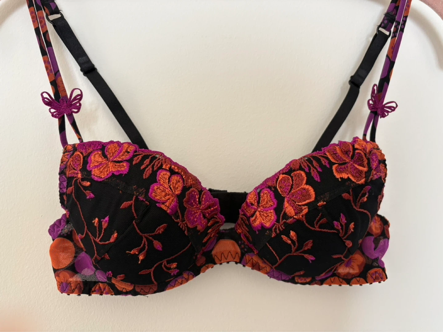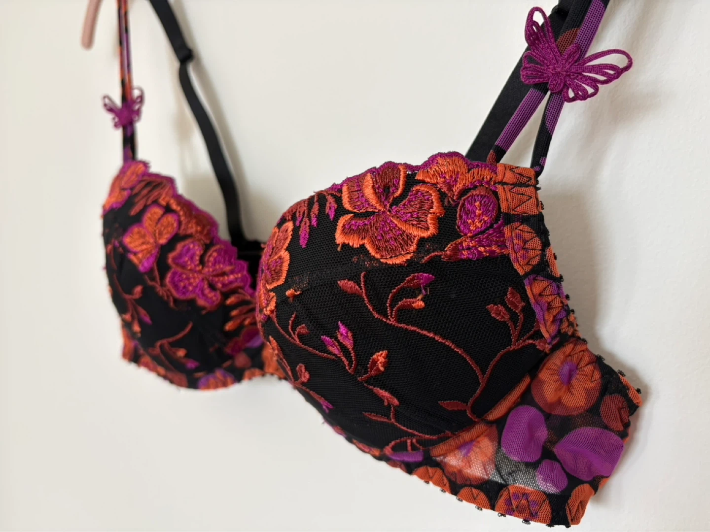 Delicate balconette-style bra with vibrant floral embroidery. Black mesh base with orange and purple stitched blossoms. Adjustable straps with butterfly accents. Lightly structured cups for lift and shape.