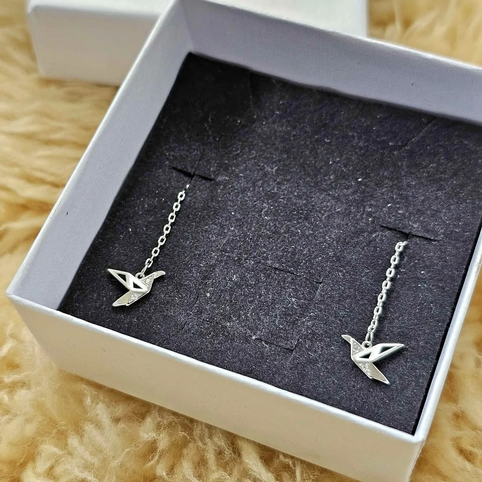 Delicate sterling silver paper crane origami threader earrings, brand new in box.