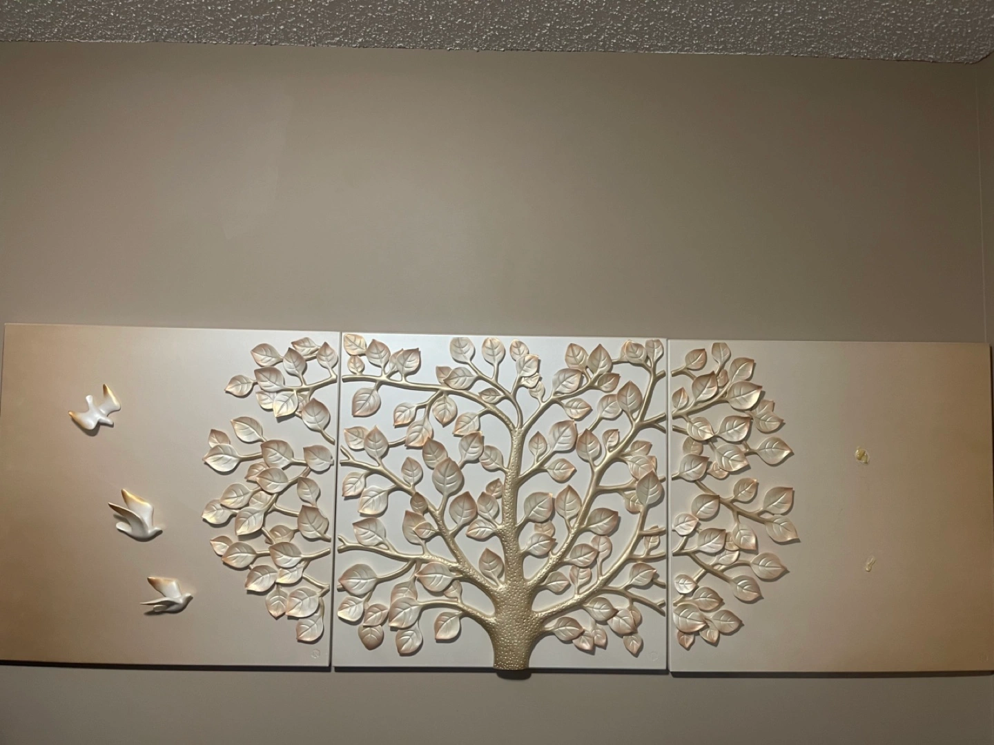 3-piece 3D wall decor with a gold tree and doves. Made of a lightweight material. 2 doves came off but can be glued back on.