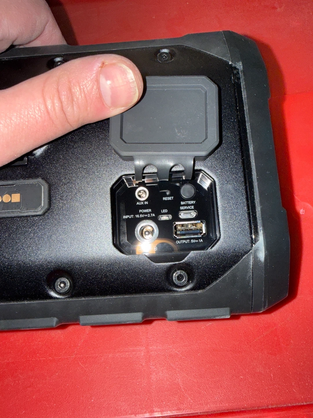 This is a rugged, black Jeep branded Bluetooth speaker. It has auxiliary input, LED indicator, and a USB output for charging. It also includes power and reset buttons.