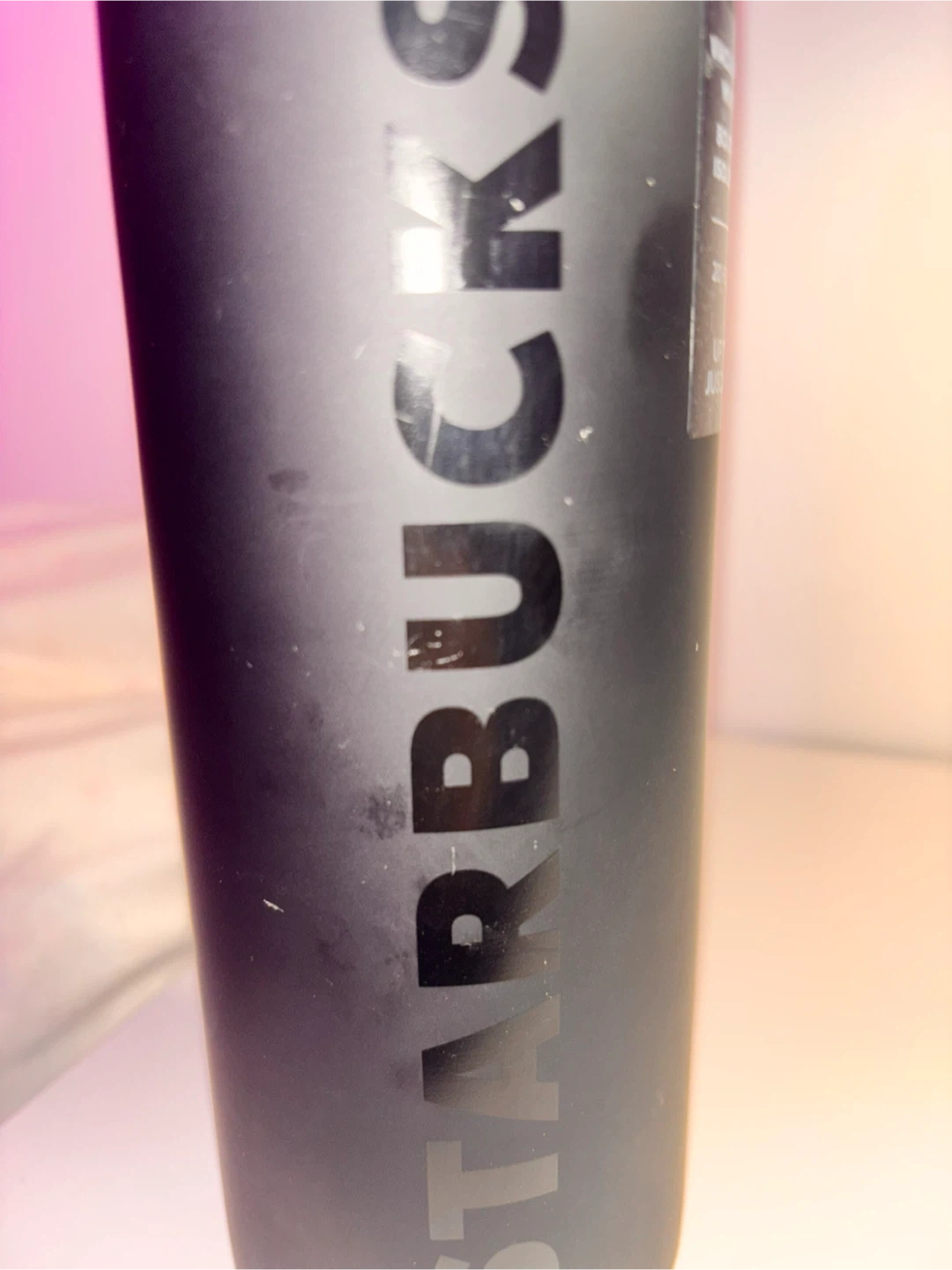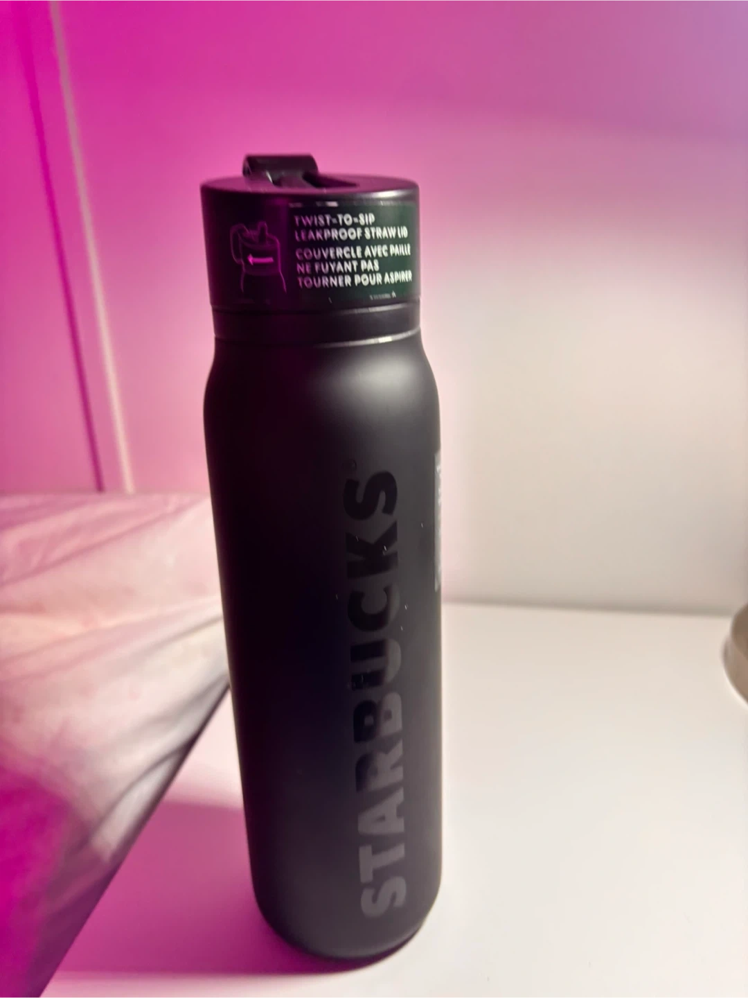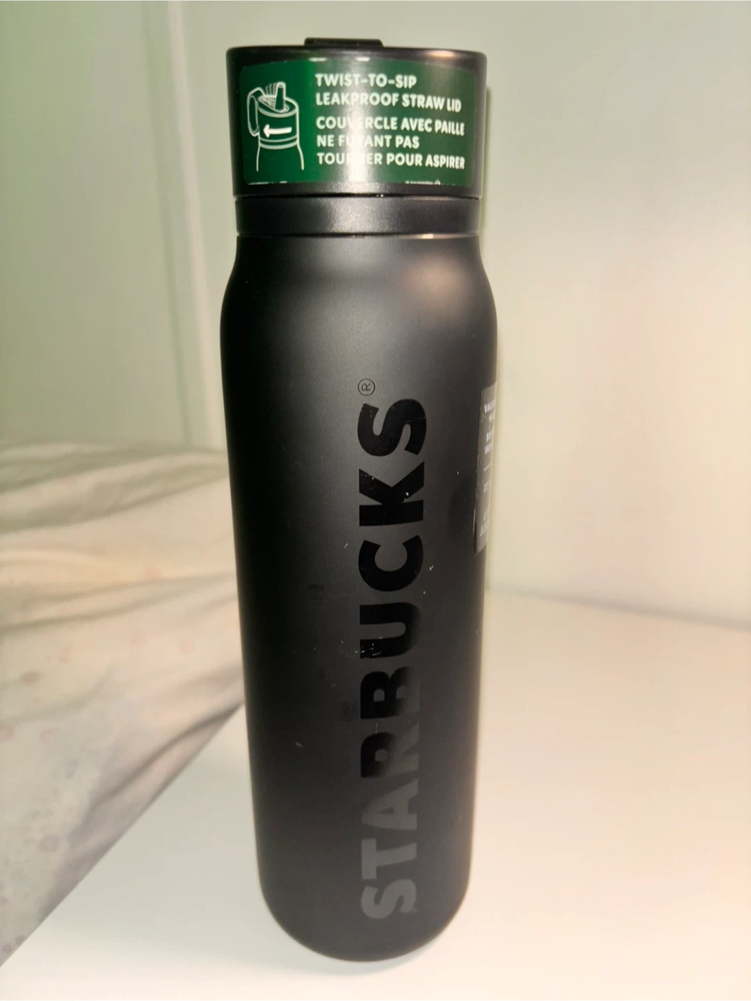 Starbucks vacuum insulated water bottle in black. It's a 20 oz (591 ml) bottle. The lid is a twist-to-sip, leakproof straw lid. It keeps drinks cold for up to 8 hours. One little scratch