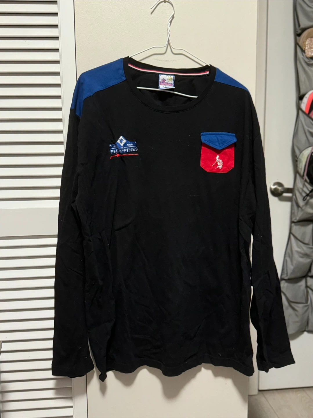 Black long sleeve t-shirt featuring a "Philippines" graphic and a faux pocket design. Blue accents on the shoulders and pocket trim. Made with a comfortable cotton blend.
