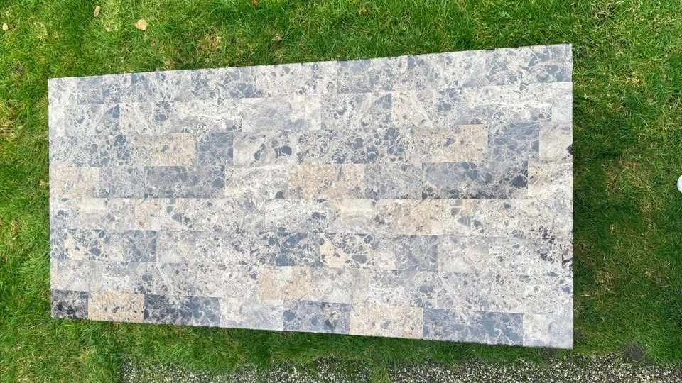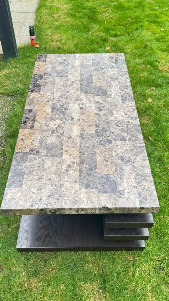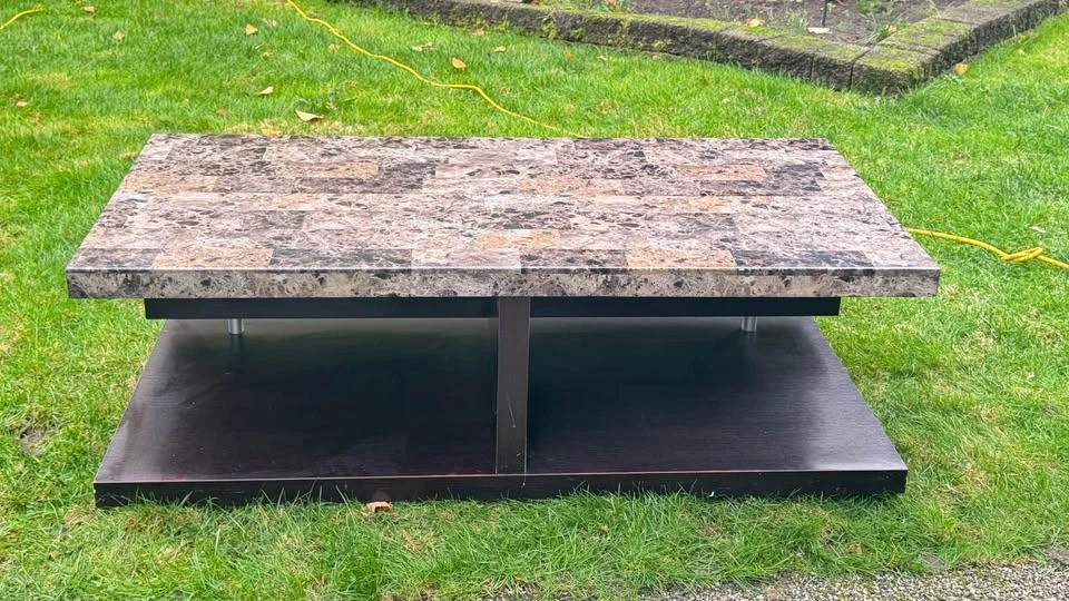 Stylish modern coffee table with a marble-look top and dark wood base. This table is used and in okay condition. The top has the look of marble but is not real marble. The surface is printed with a marble pattern, sealed under a wear-resistant layer, so the table is not very heavy and easy to move. There are some scratches and a little discolouration on the very bottom.