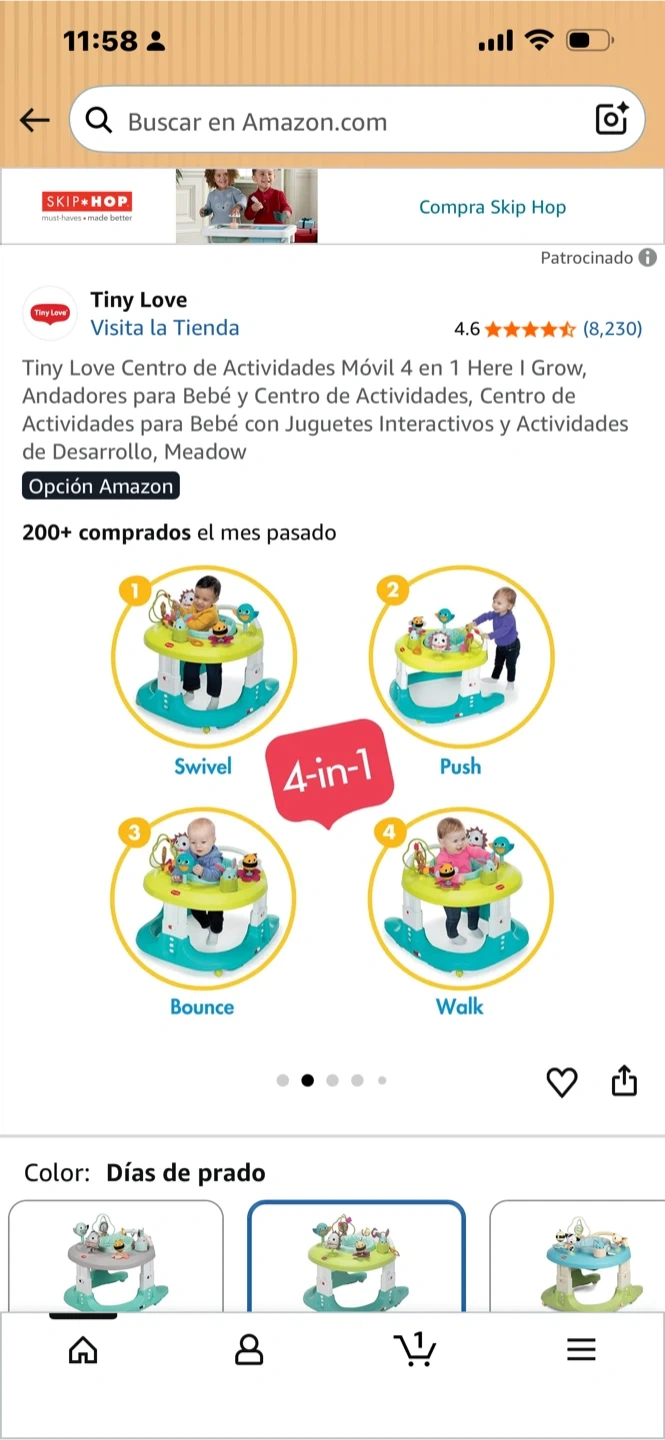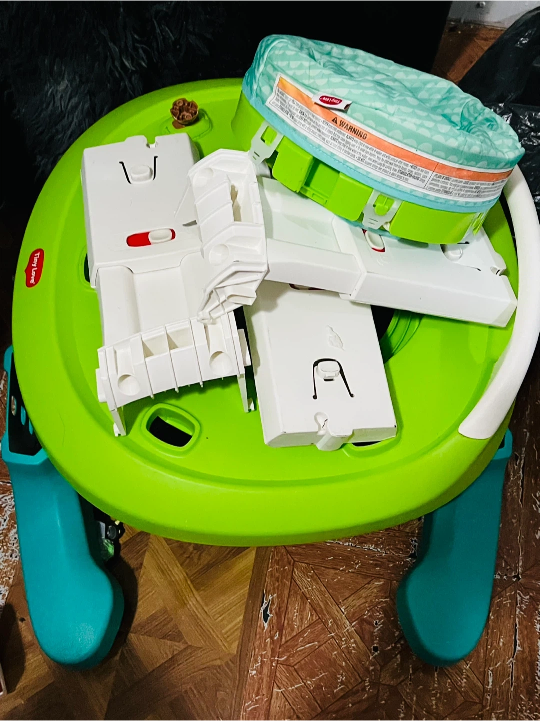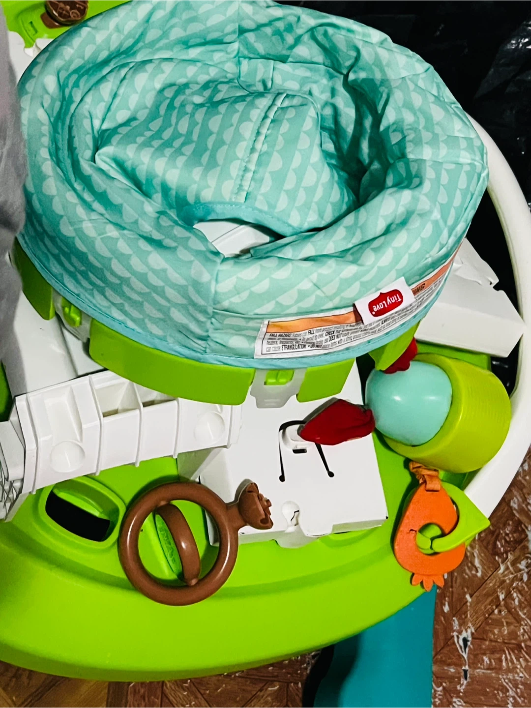 This Tiny Love activity center features a 4-in-1 design with swivel, push, bounce, and walk modes. It's designed for babies and toddlers. Includes multiple interactive toys.