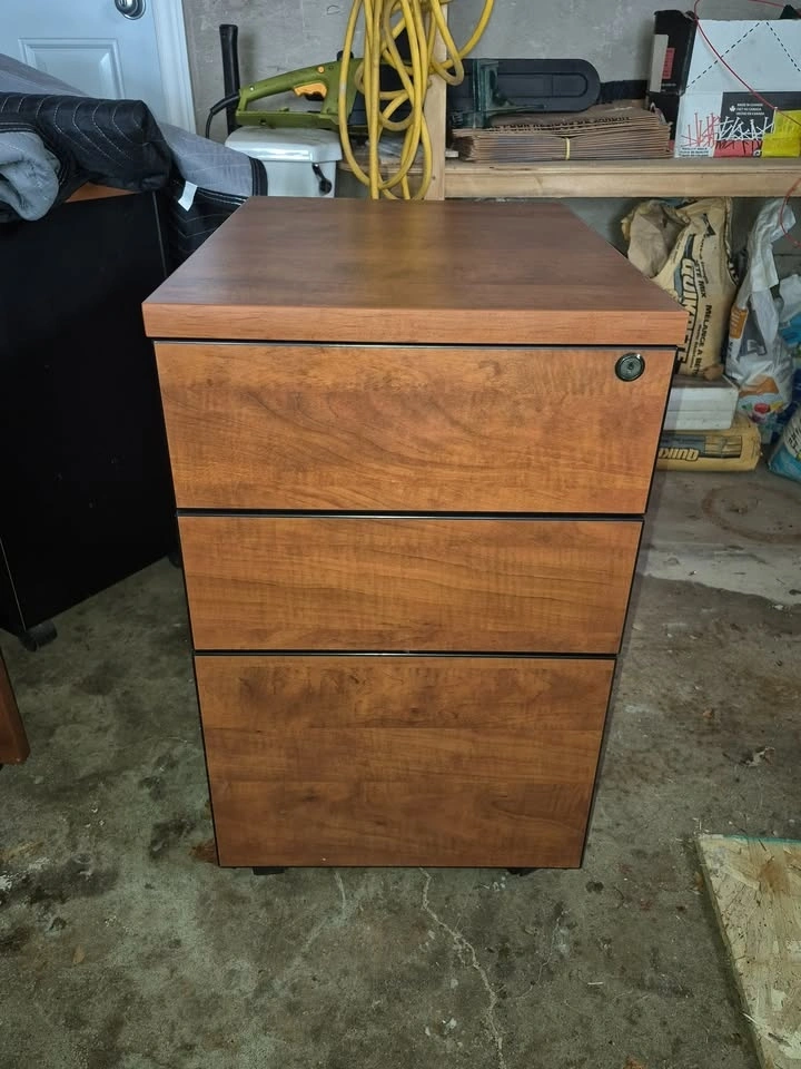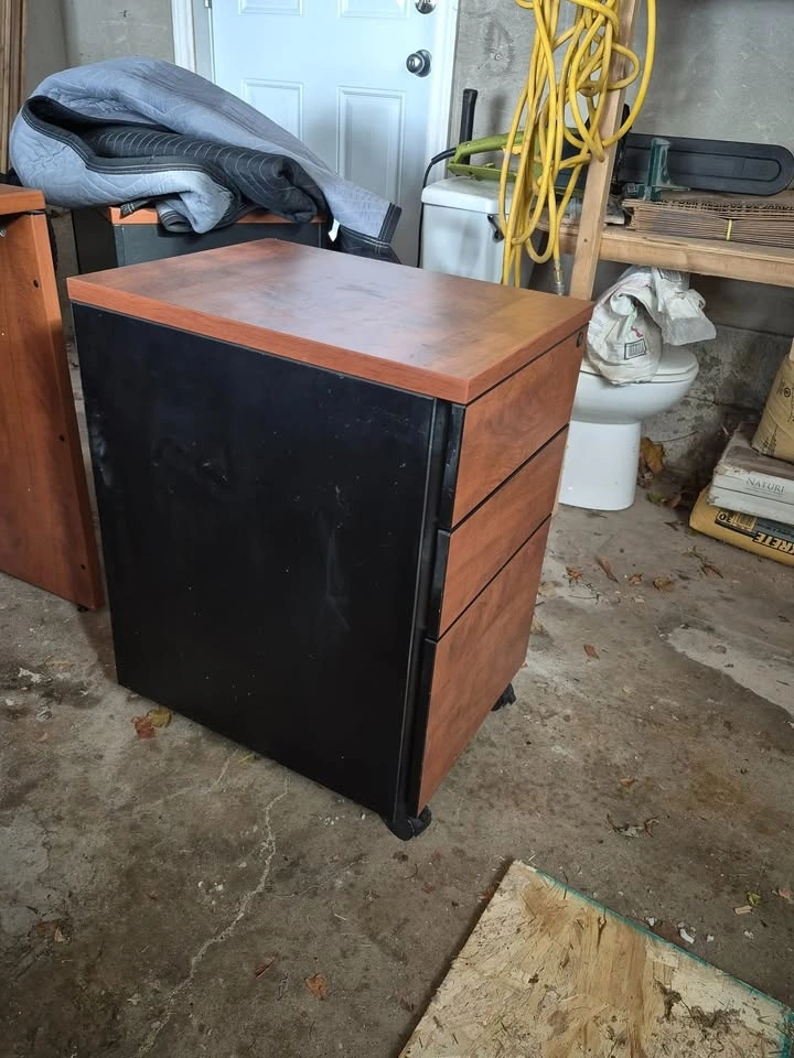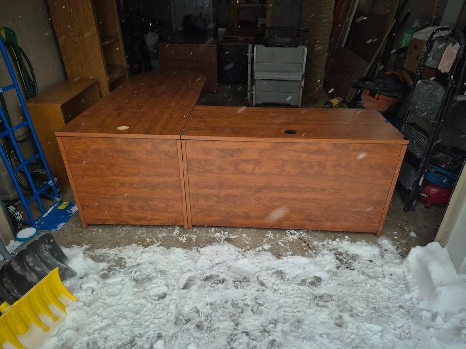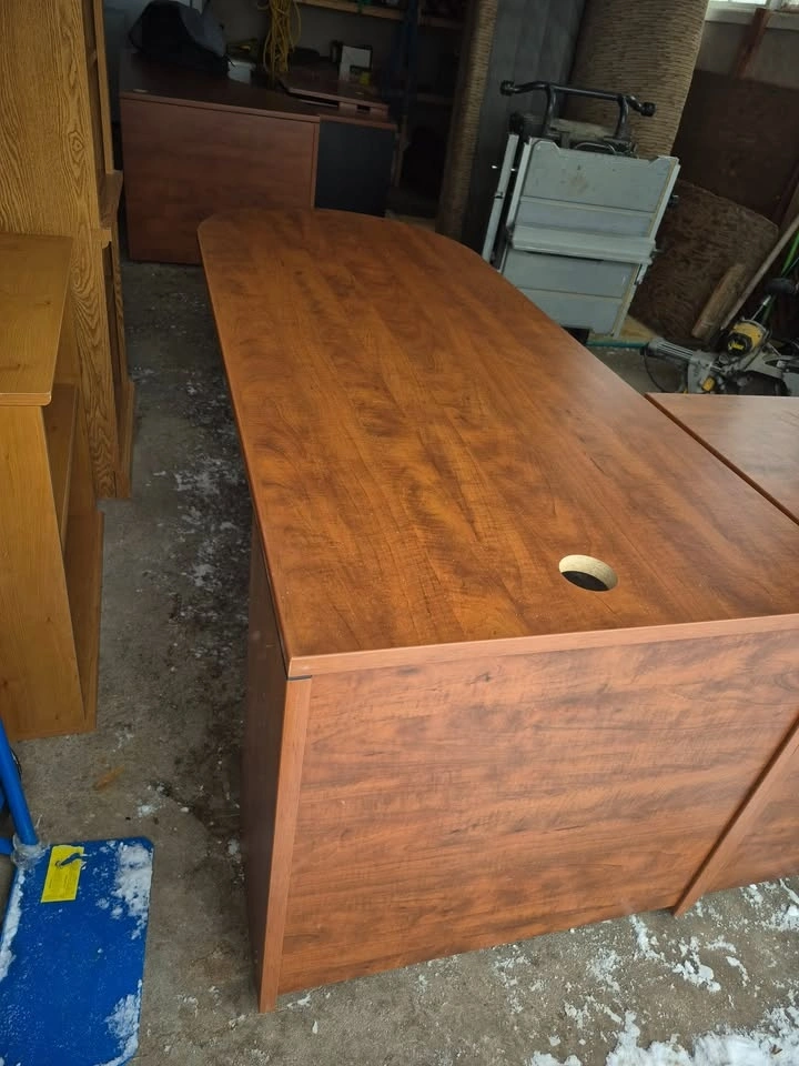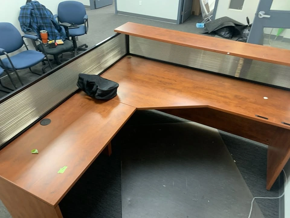 1x Reception desk (L-shaped): 6' long each way, 2' wide top, 30" tall. 1x Executive desk (L-shaped): 6' long one way, 7' long the other way. The 6' side is 30" wide, the 7' side is 24" wide. Both desks are 30" tall. Includes 3 matching file cabinets (wood veneer finish), designed to fit under the desks. Cabinet dimensions: 21.5" x 16.5" x 28". $450 obo.