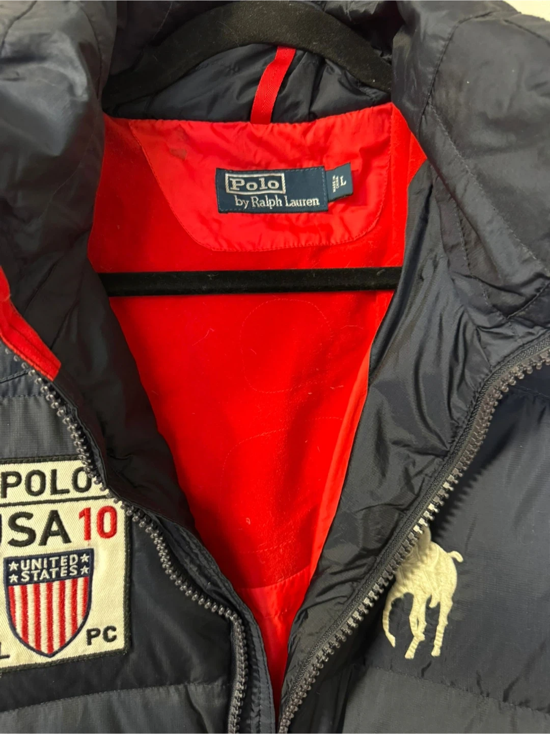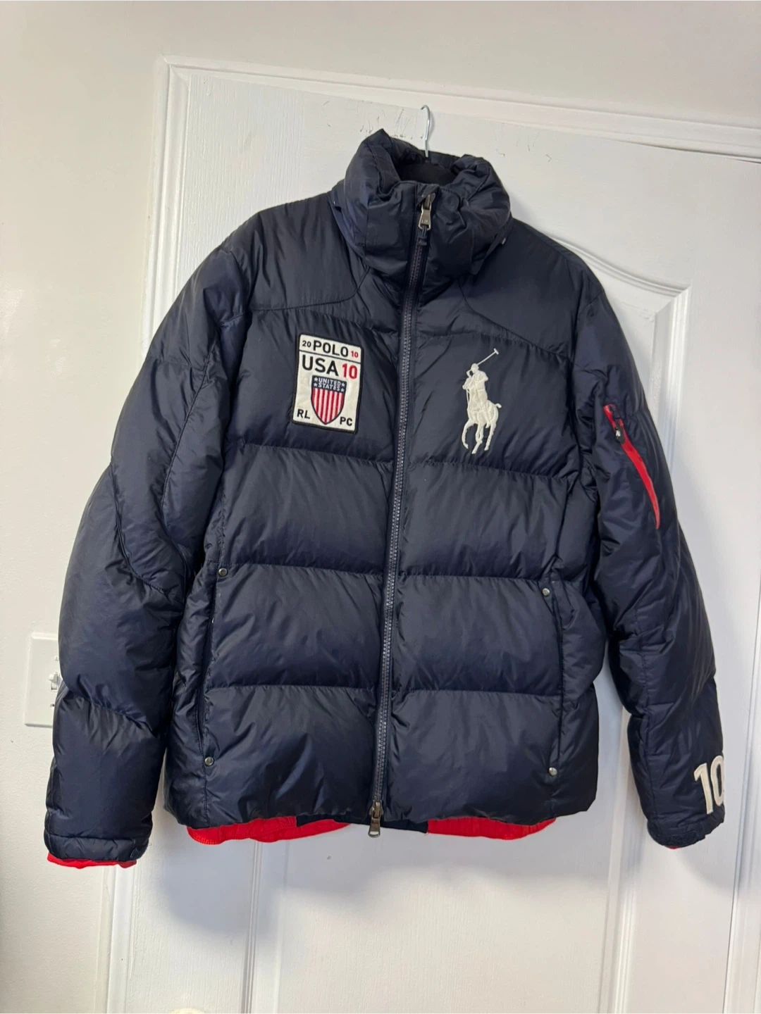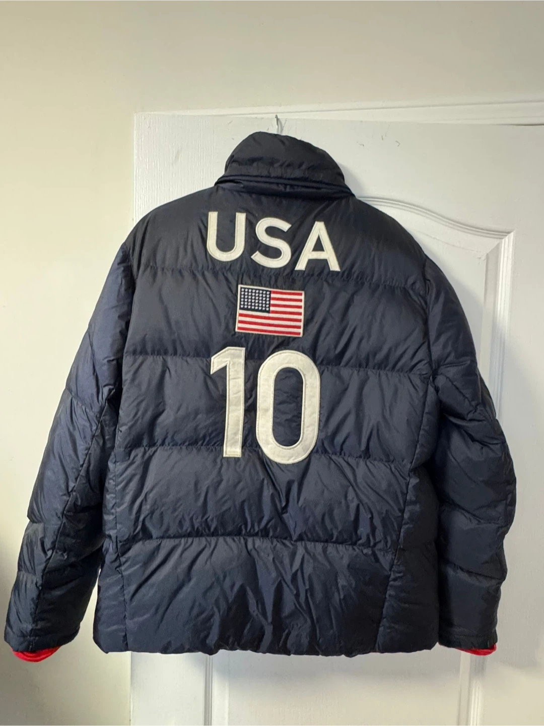 Dark navy puffer jacket with a red lining. It features the Polo by Ralph Lauren logo and USA Olympic patches. The back has "USA" and the number "10".