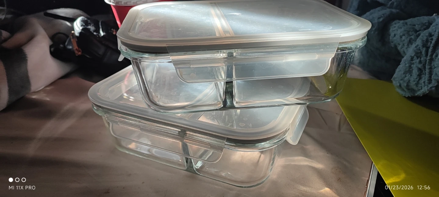 glass food storage containers with split compartments. Each container has a secure-locking lid. Glass material is durable and easy to clean. Perfect for meal prepping or storing leftovers!