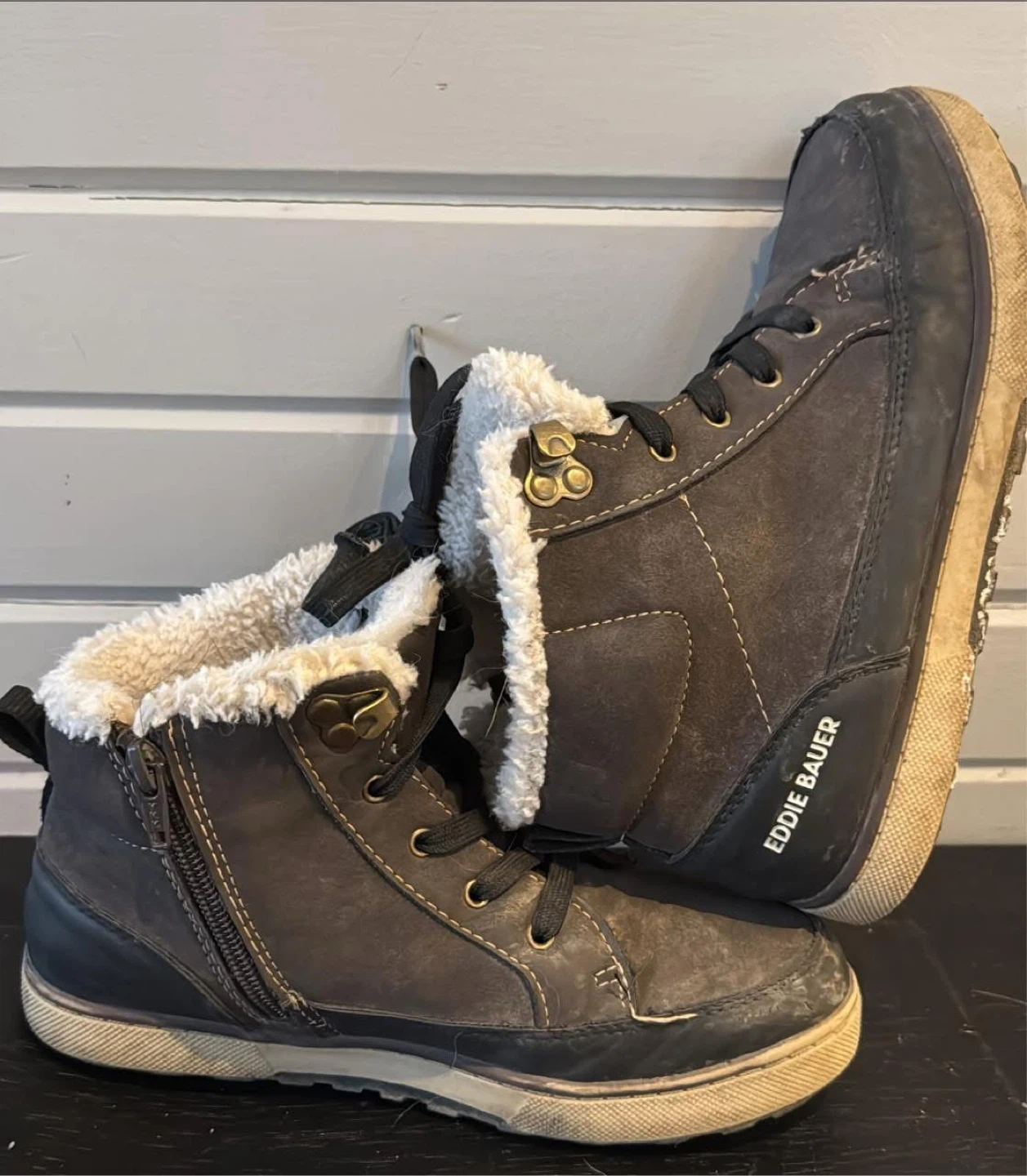 These Eddie Bauer winter boots are dark brown with a cozy faux fur lining and side zippers. They feature laces for a secure fit and a durable rubber sole. Great for keeping little feet warm during colder months!