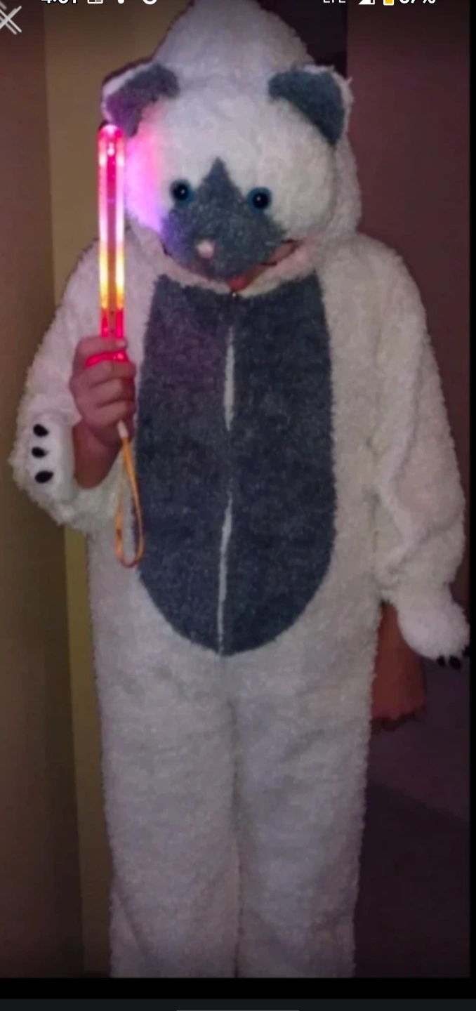 White and gray furry polar bear zip-up costume with hood/headpiece (face) and attached tail in excellent condition.