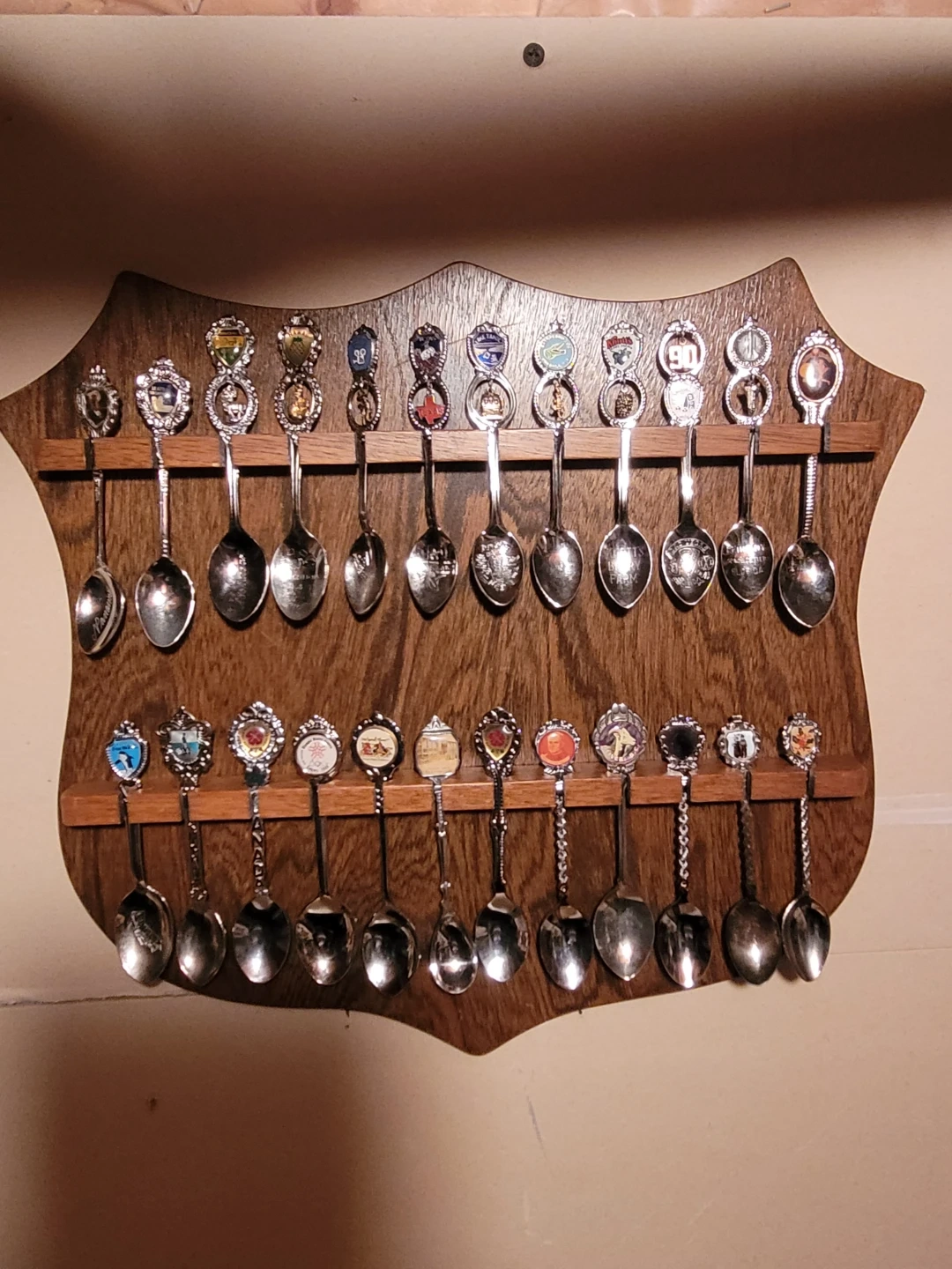 This collection features 26 decorative souvenir spoons, each with a unique design and some showing embossed text like '90'. The spoons are made of metal and come mounted on a wooden display board. They're great for collectors or as a decorative accent for your home!