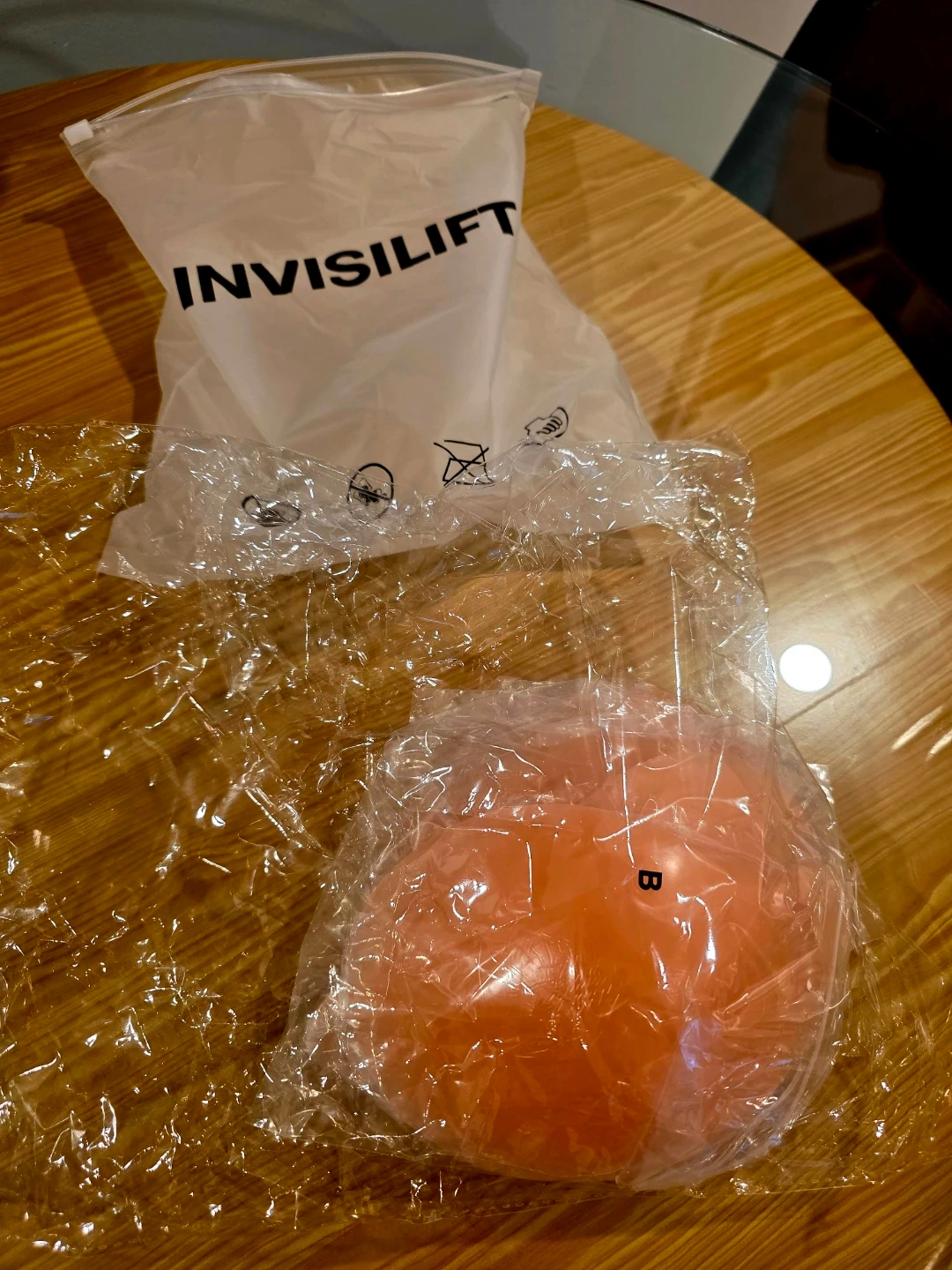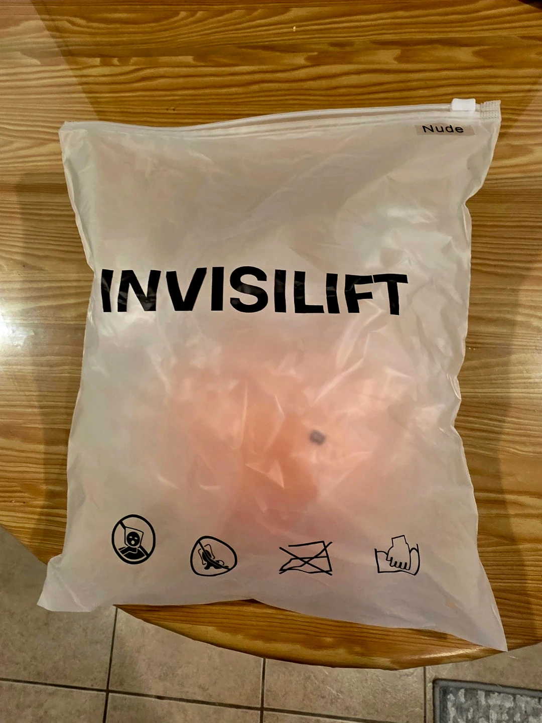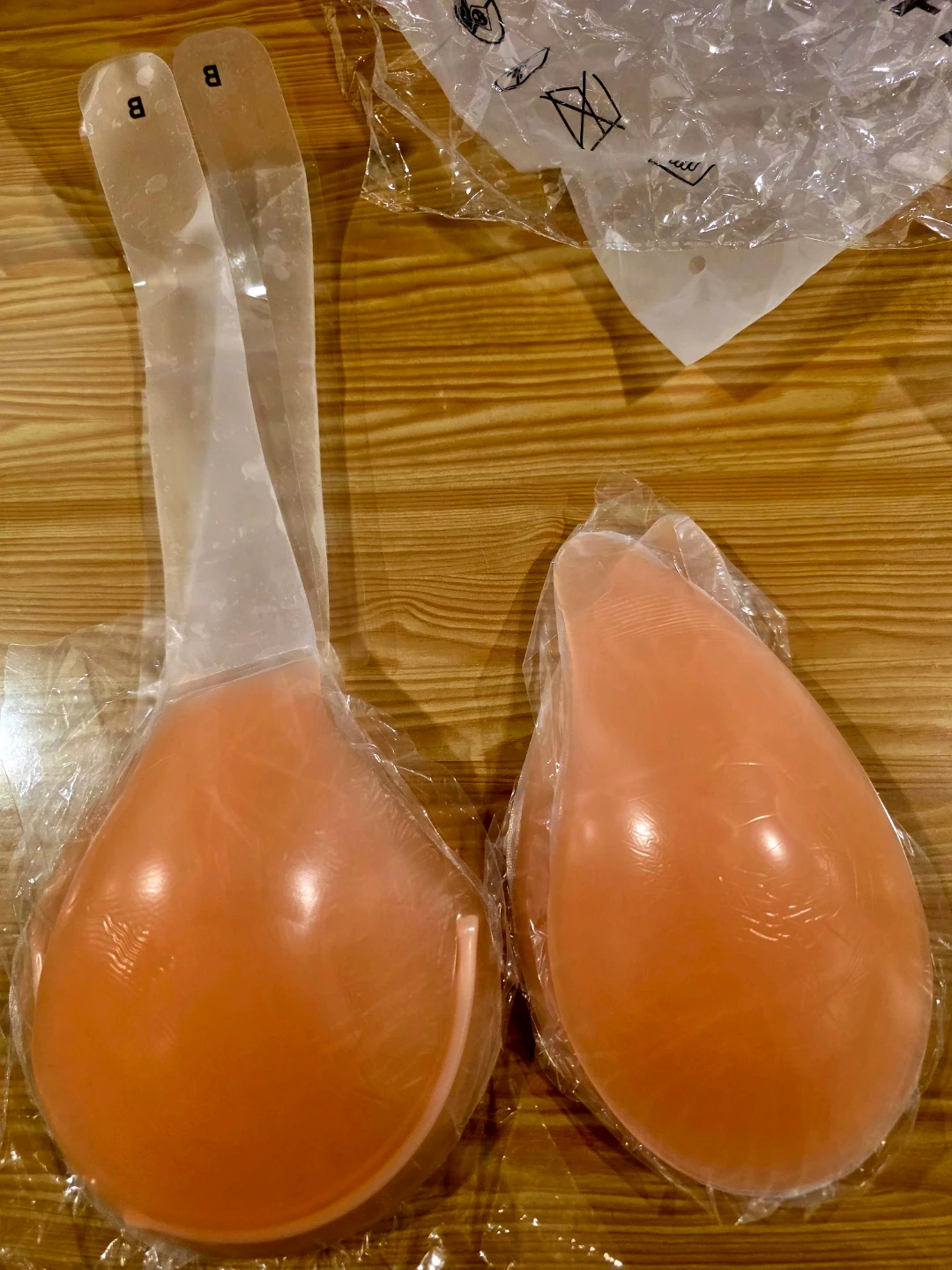 These are Invisilift bra inserts in a nude colour. They're made of silicone and come in a reusable bag. These inserts add a bit of lift and shape.