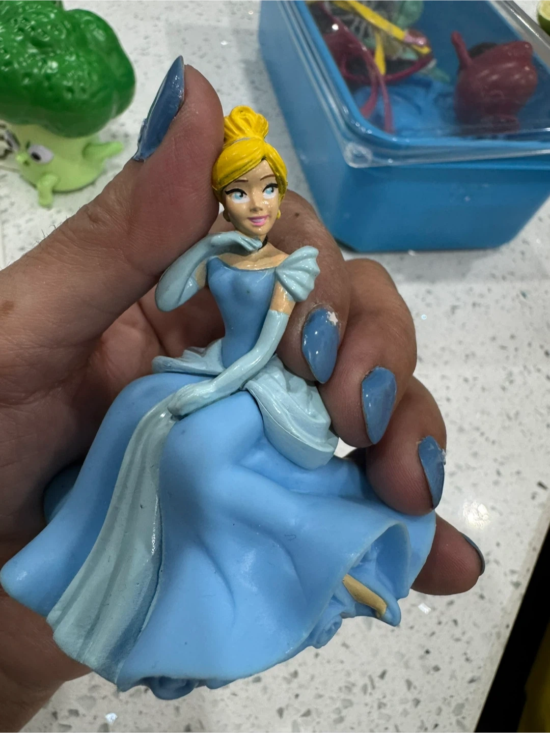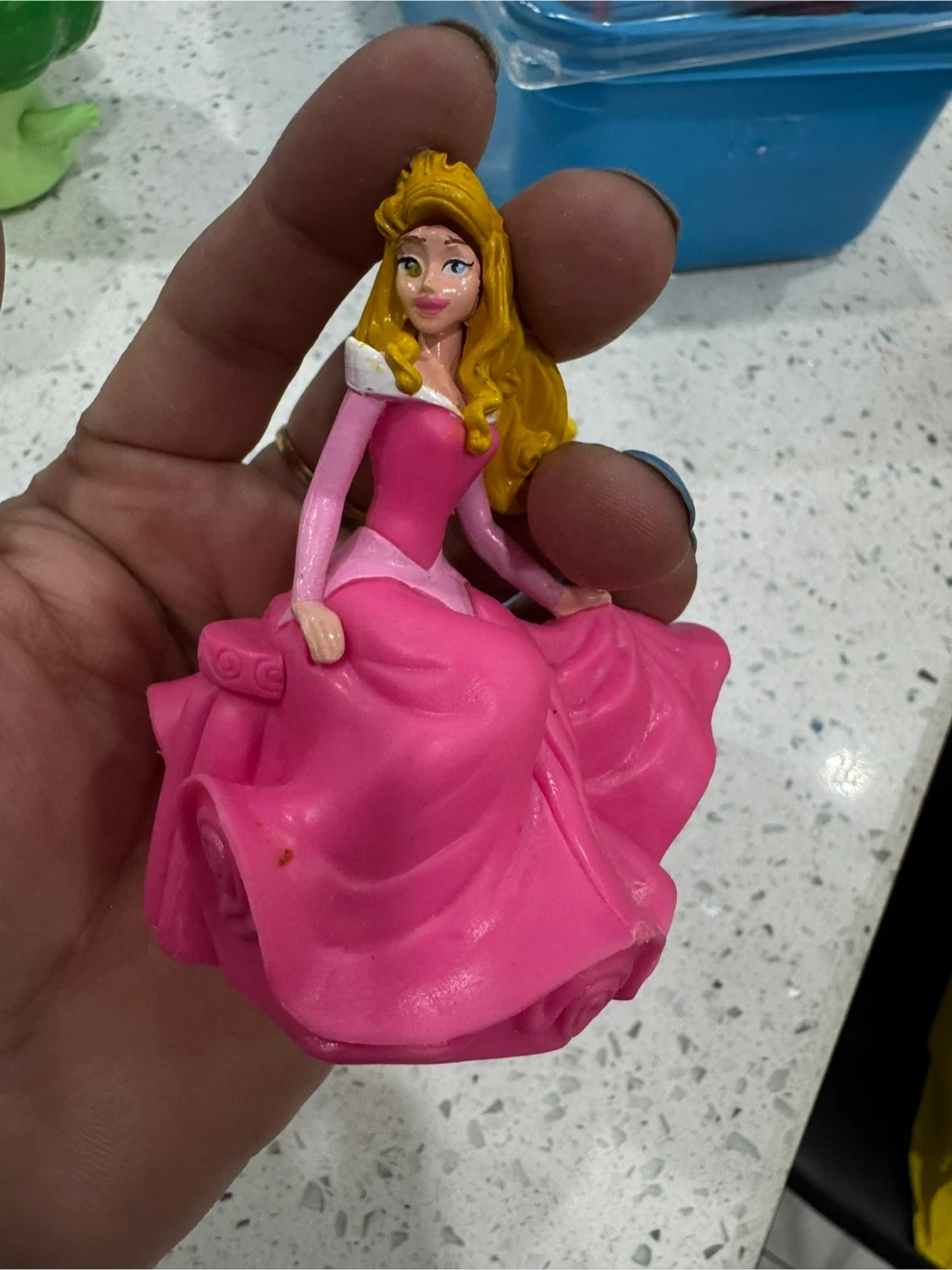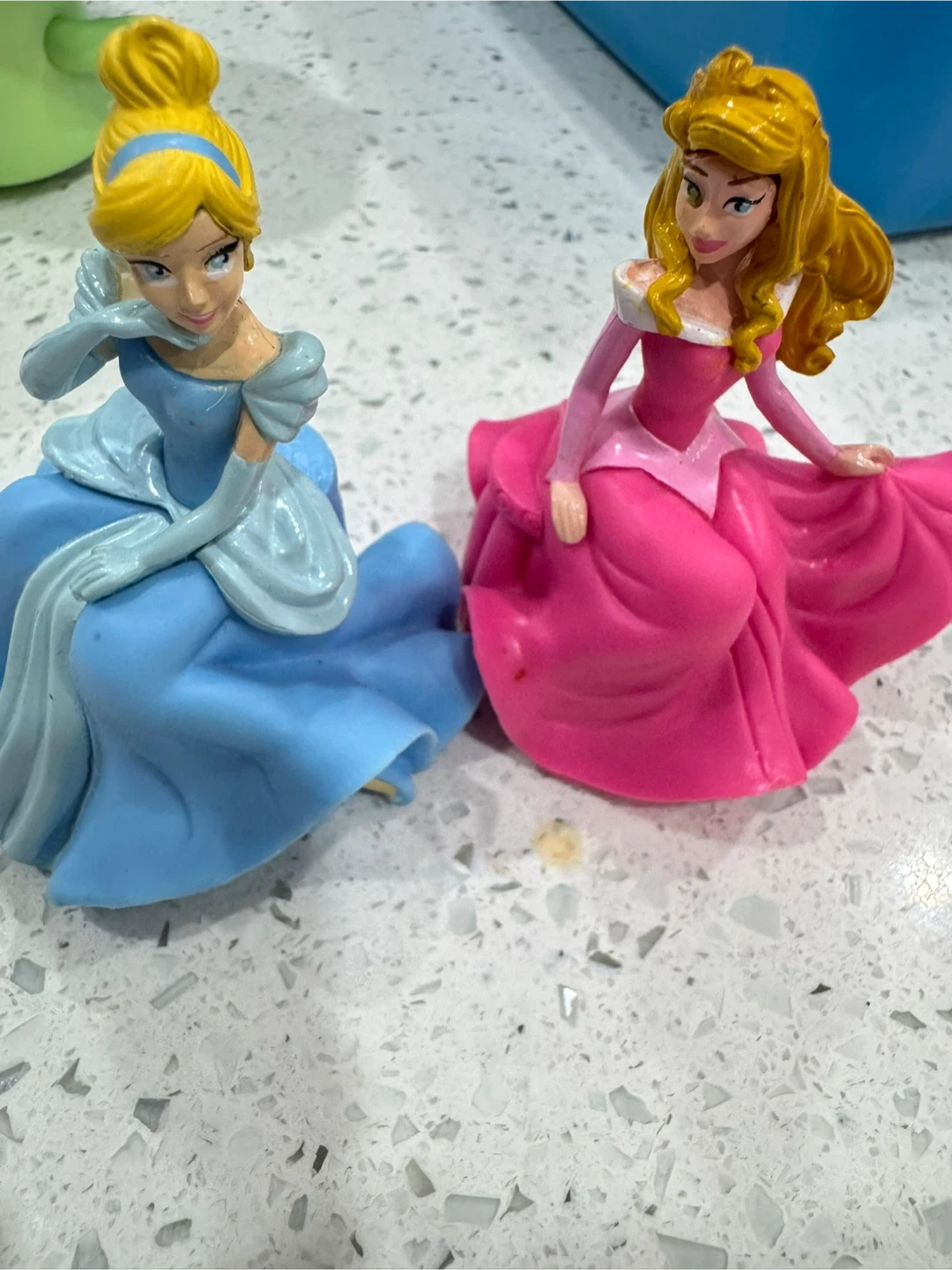 Two Disney Princess figurines featuring Cinderella in blue and Aurora in pink. These plastic figures are perfect for any fan's collection. They're great for imaginative play or display!