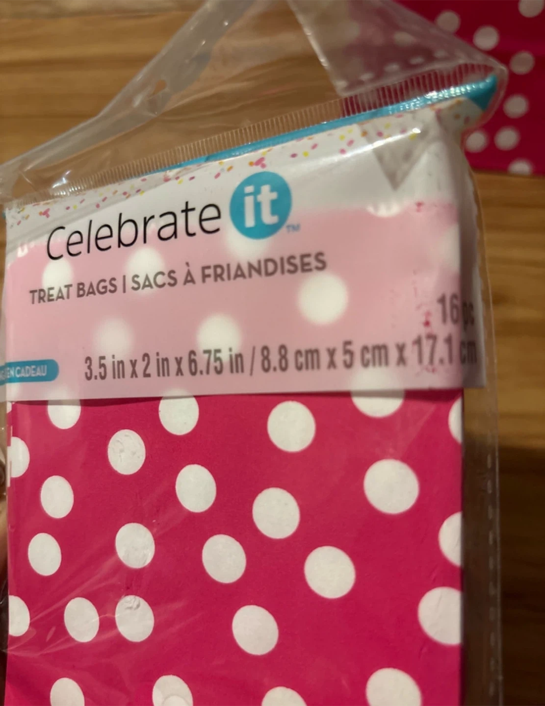 These Celebrate It treat bags are perfect for parties and gifts; they measure 3.5 inches by 2 inches by 6.75 inches. They come in a vibrant pink with white polka dots and one package is sealed, containing 15 bags new. Missing one. Add a pop of fun to your next celebration!